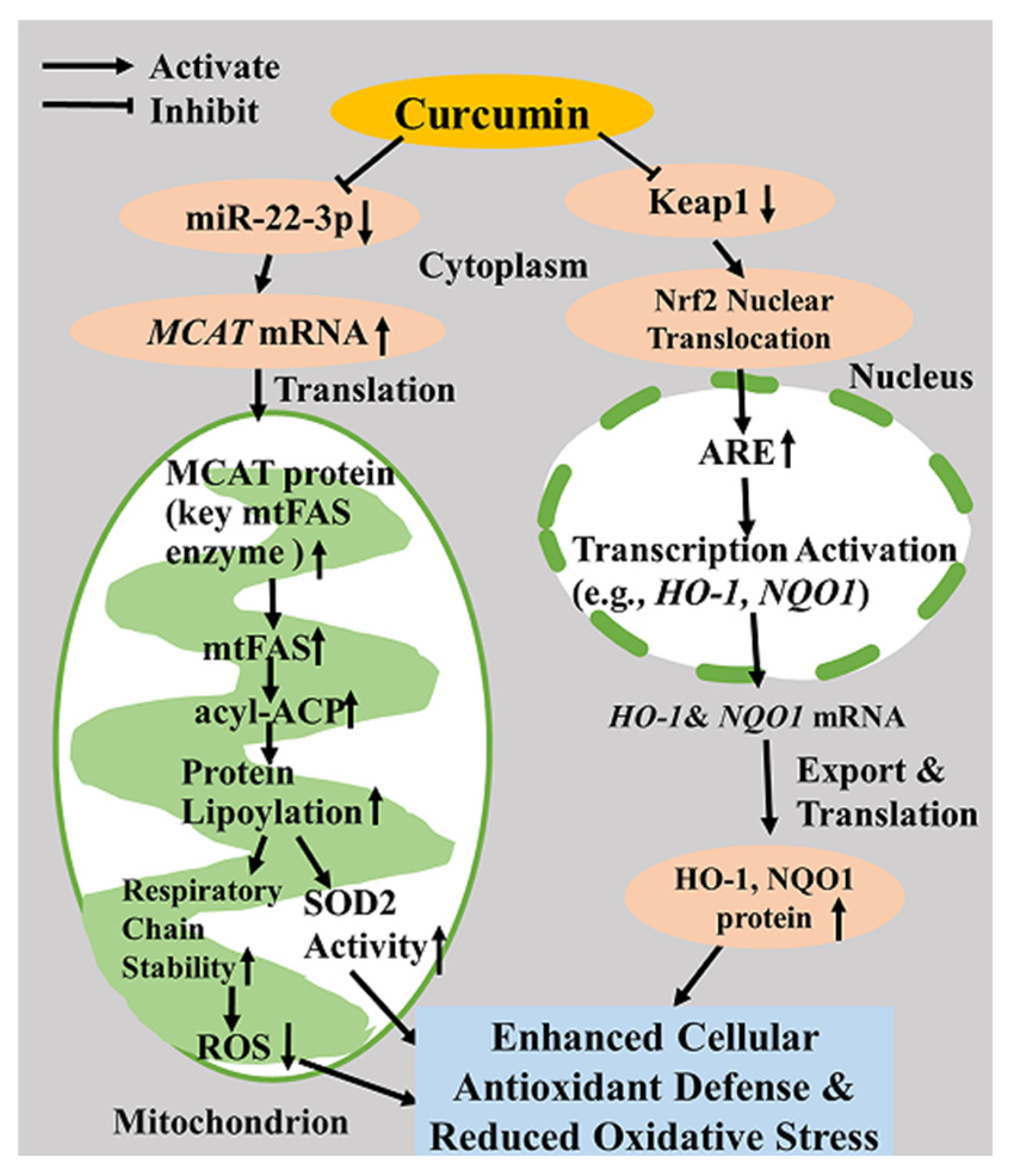 Based on the analysis, this study proposes a mechanistic axis linking the bioactivity of dietary curcumin to cellular stress tolerance: curcumin enhances mitochondrial antioxidant defense by suppressing miR-22-3p expression, thereby upregulating MCAT. This pathway was systematically investigated in human hepatic LO2 cells through an integrated approach combining bioinformatic prediction, dual-luciferase reporter assays, gain- and loss-of-function experiments, and comprehensive assessment of redox balance and mitochondrial function. The results substantiate this mechanistic axis and elucidate a novel post-transcriptional mechanism through which curcumin augments cellular antioxidant capacity.