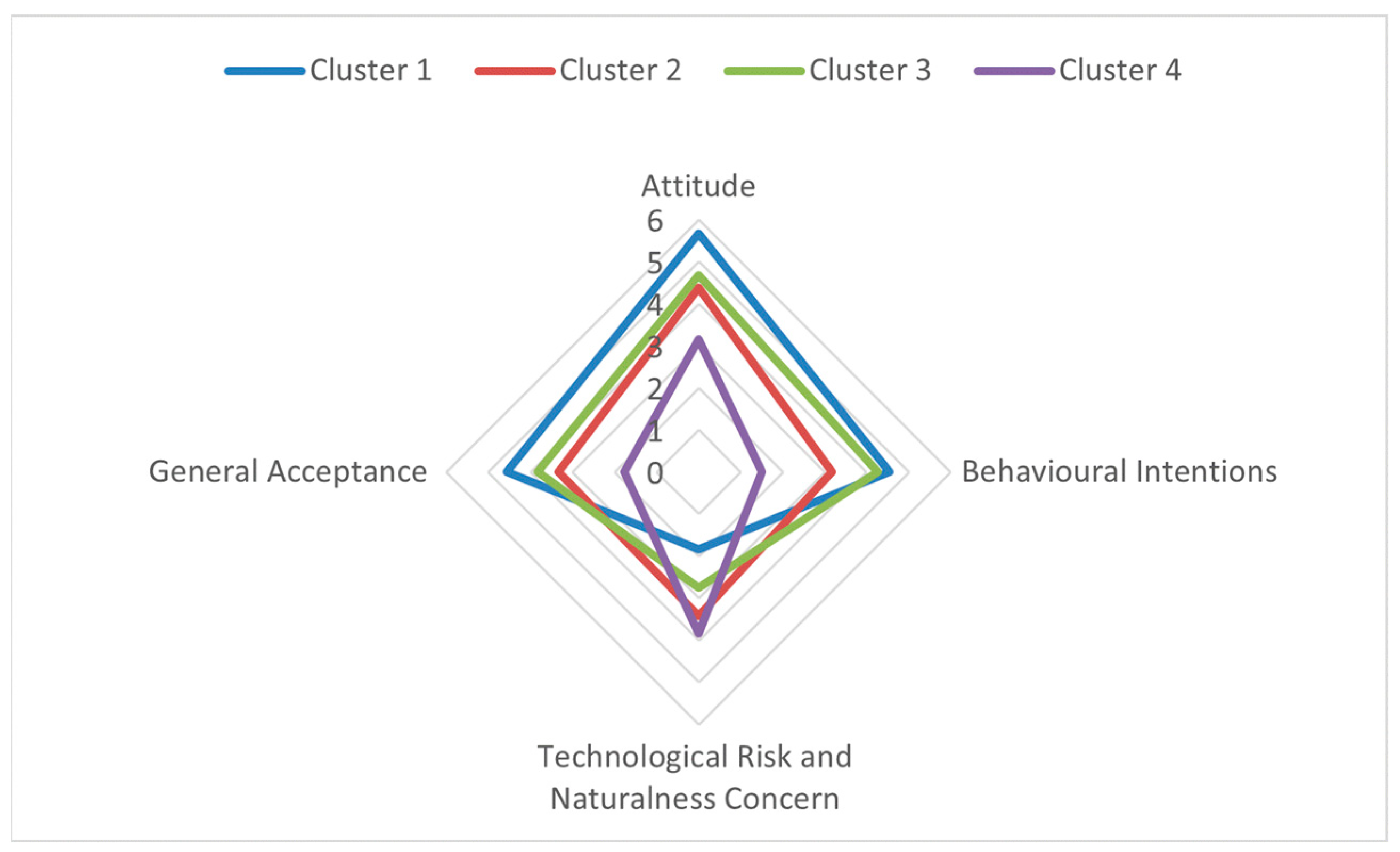 | Variable | Category | Cluster 1 Highly Receptive Consumers | Cluster 2 Concerned Ambivalents | Cluster 3 Cautious Optimists | Cluster 4 Strong Sceptics |