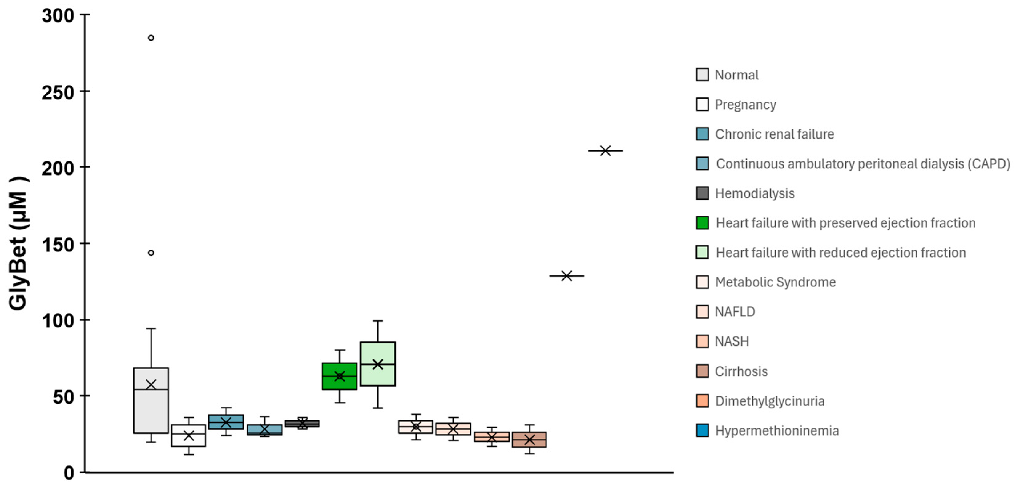 Figure 1. Boxplot comparing plasma GlyBet (µM) distributions across physiological and pathological conditions. Each box shows median, interquartile range, whiskers and outliers. Metabolic disorders (hypermethioninemia, dimethylglycinuria) display the highest GlyBet values; heart failure and metabolic syndrome show moderate increases; and pregnancy, NAFLD/NASH and cirrhosis are associated with lower levels. Renal conditions (chronic renal failure, CAPD, hemodialysis) exhibit wide variability, reflecting the strong influence of kidney function on betaine clearance. Overall, the pattern highlights GlyBet’s sensitivity to metabolic and renal disturbances and its potential utility as a biomarker. Data were compiled from published clinical and metabolomic studies and from the Human Metabolome Database (HMDB); glycine betaine is listed in HMDB under HMDB0000043. Primary literature sources used to assemble the dataset and annotate group labels: Abdelmalek et al., 2009 [38], Bahado Singh et al., 2012; 2014 [22,23]; Barić et al., 2004 [24]; Sookoian et al., 2017 [39]; Corbin et al., 2012 [37]; Kalhan et al., 2011 [35]; Koike et al., 2014 [25]; Laryea et al., 1998 [34]; Lever et al., 1994; 2005 [36,40]; McGregor et al., 2001 [26]; Psychogios et al., 2011 [27]; Moolenaar et al., 1999 [28]; Zordoky et al., 2015 [29].