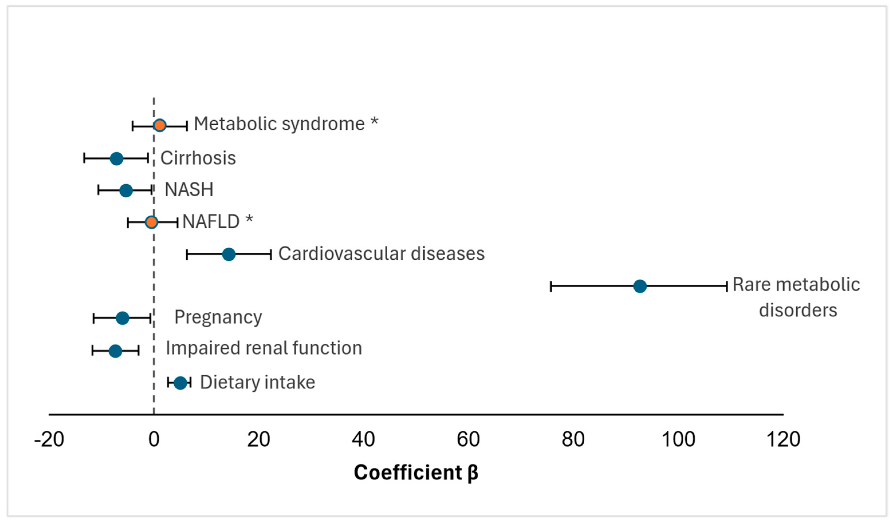 Rare metabolic disorders exhibited the largest positive association with plasma GlyBet (β4 = +92.5, SE = 8.6), reflecting endogenous accumulation linked to enzymatic defects in one-carbon metabolism [24,28]. Cardiovascular diseases were also associated with higher aggregated GlyBet estimates (β5 = +14.2, SE = 4.1, p = 0.001), consistent with metabolic alterations reported in these conditions [29]. In contrast, NAFLD and metabolic syndrome were not significantly associated with plasma GlyBet at the group level, whereas NASH and cirrhosis showed significant negative associations, consistent with advanced hepatic dysfunction and impaired methylation capacity.