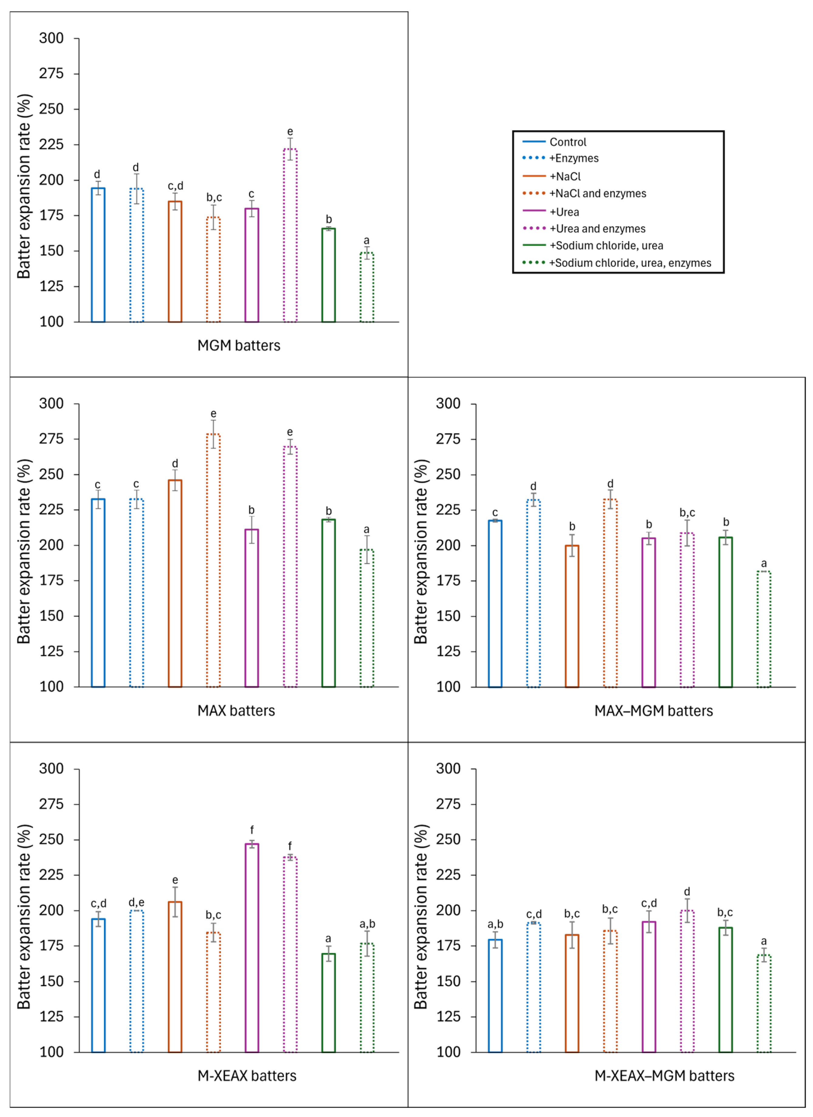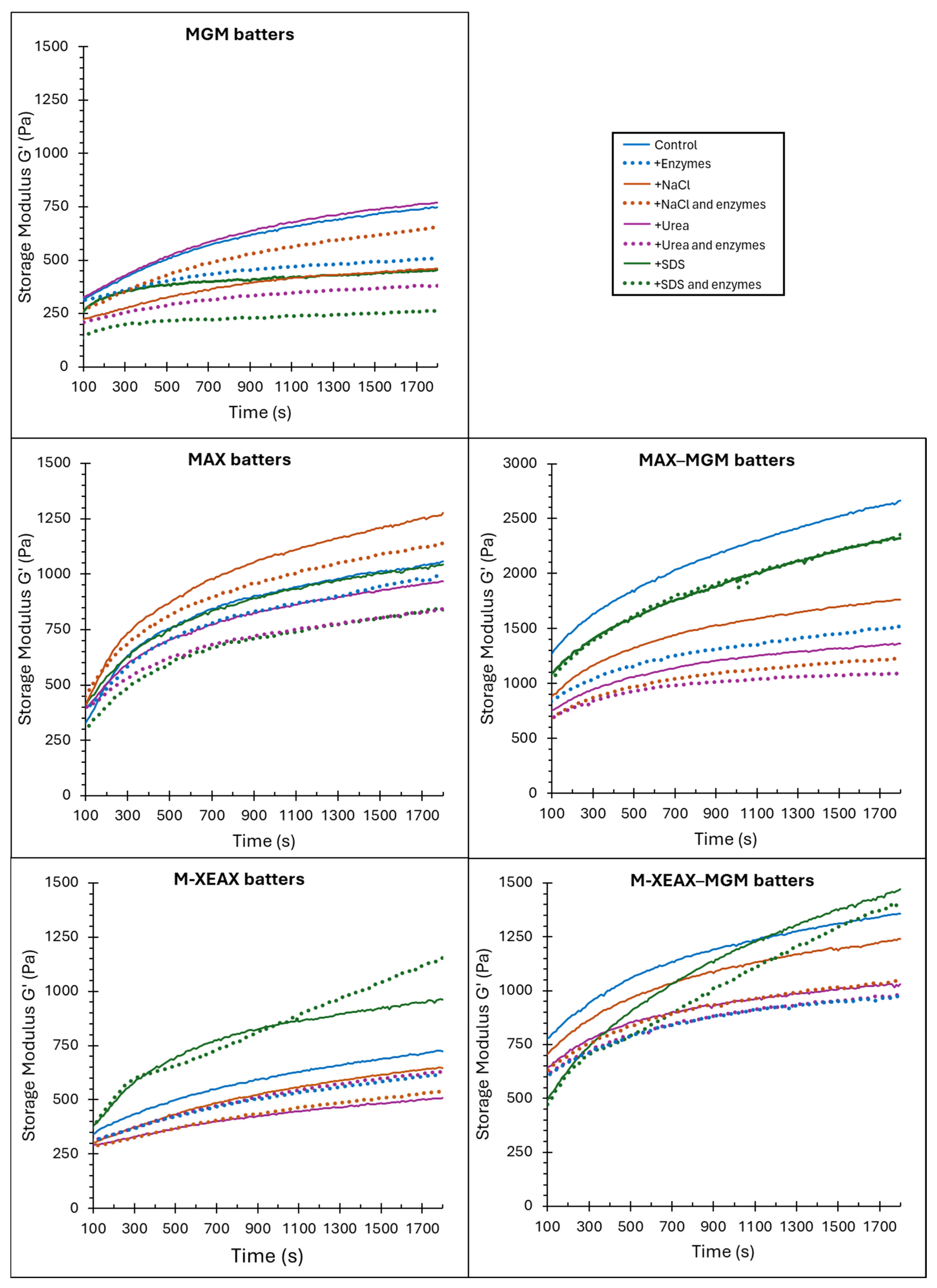 | M-XEAX-MGM | Moderate G′ changes depending on interaction suppression; negative effect of hydrophobic interactions on batter stability; SDS increased tan δ despite higher stiffness | Lowest expansion; decreased compared to M-XEAX batters | No clear relationship |