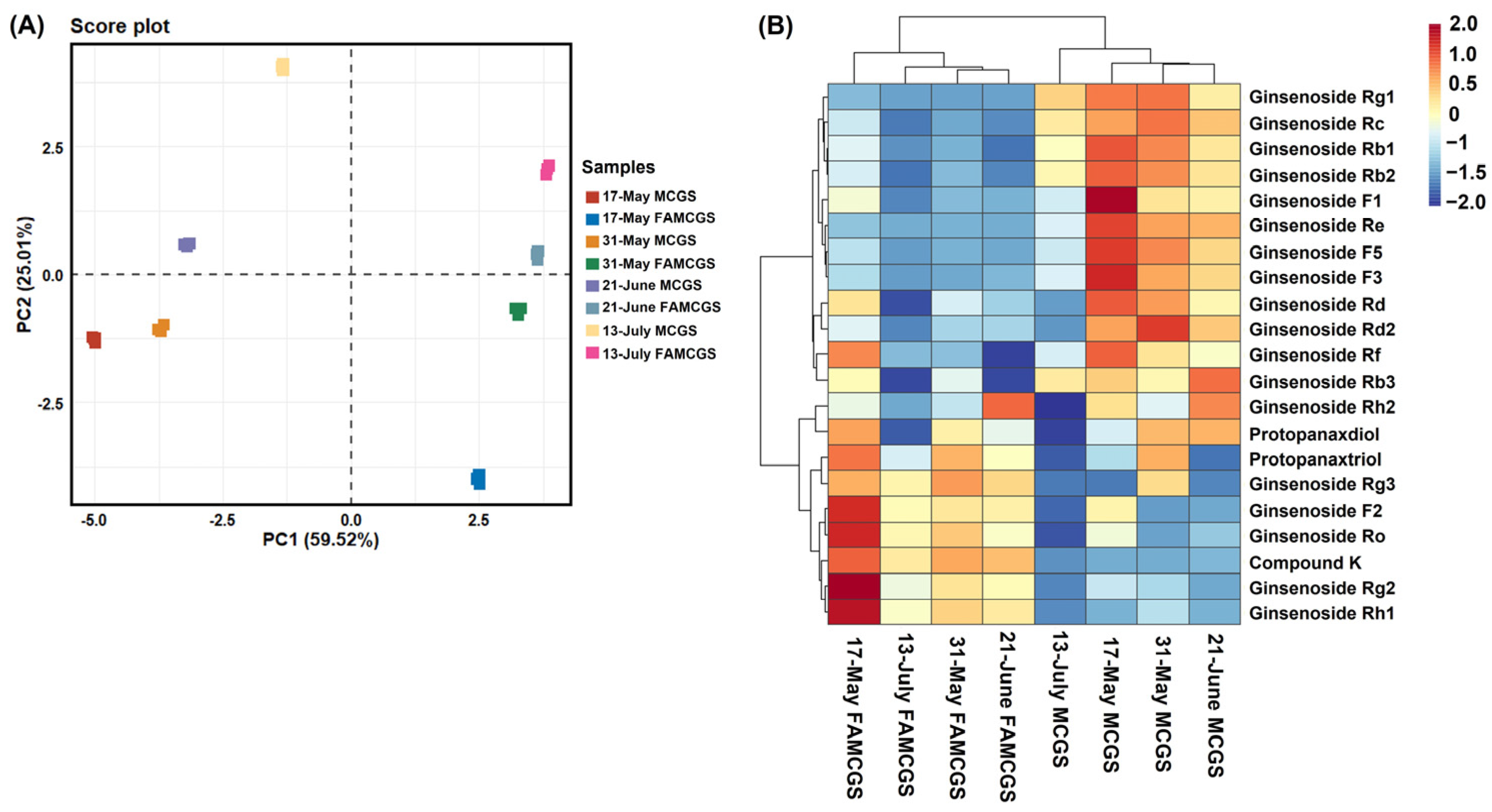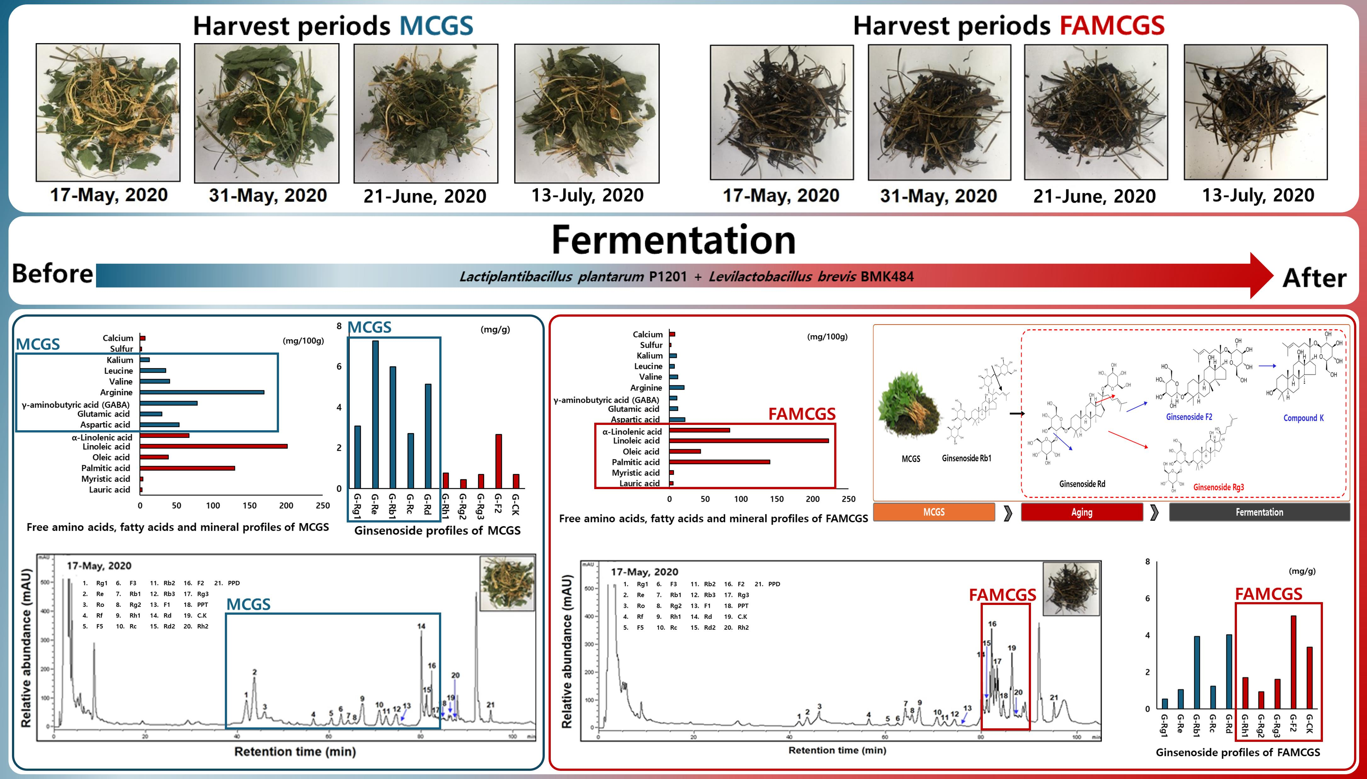 3.5. Comparison of Ginsenoside Contents of MCGS Before and After Fermentation According to Harvest Periods