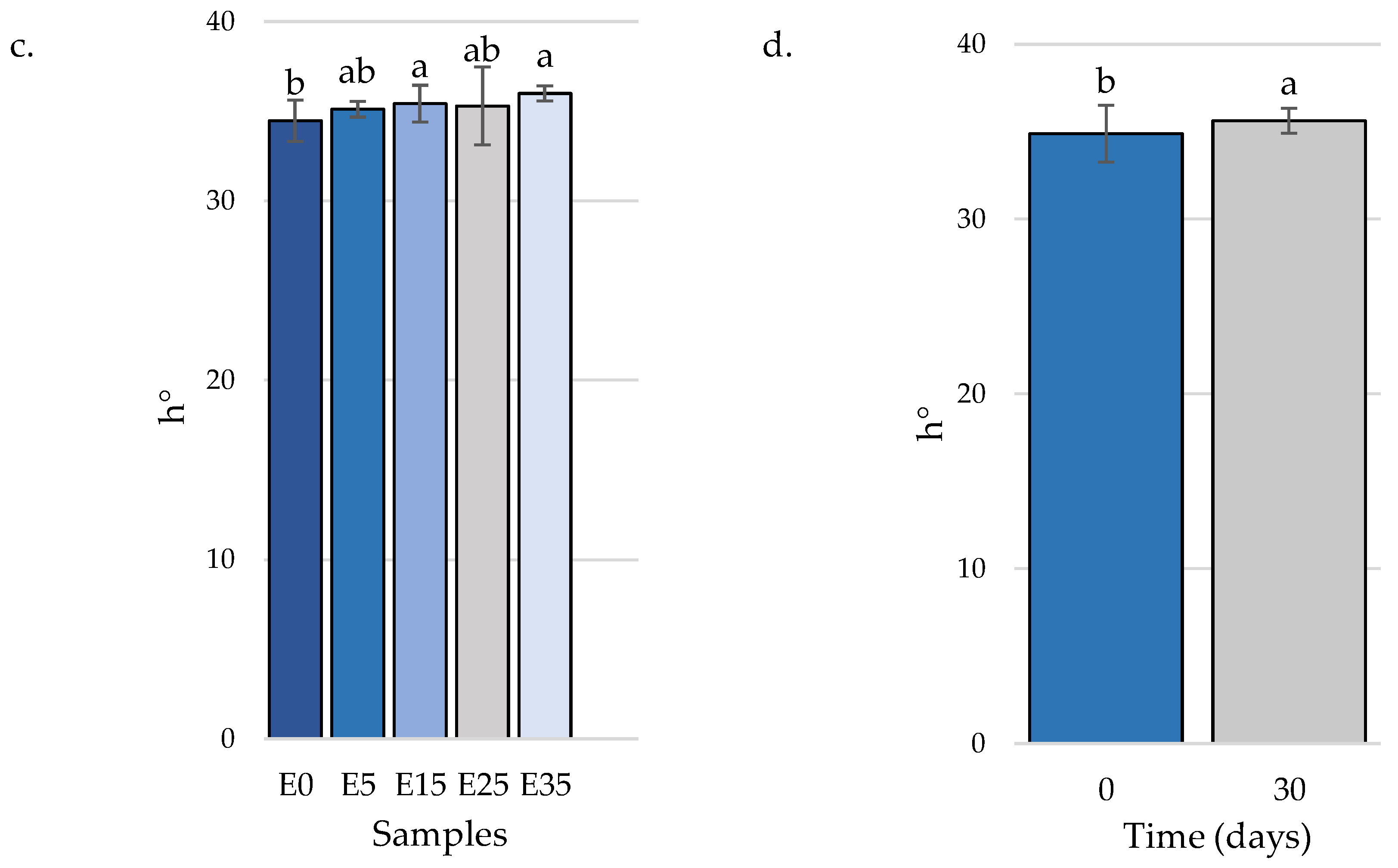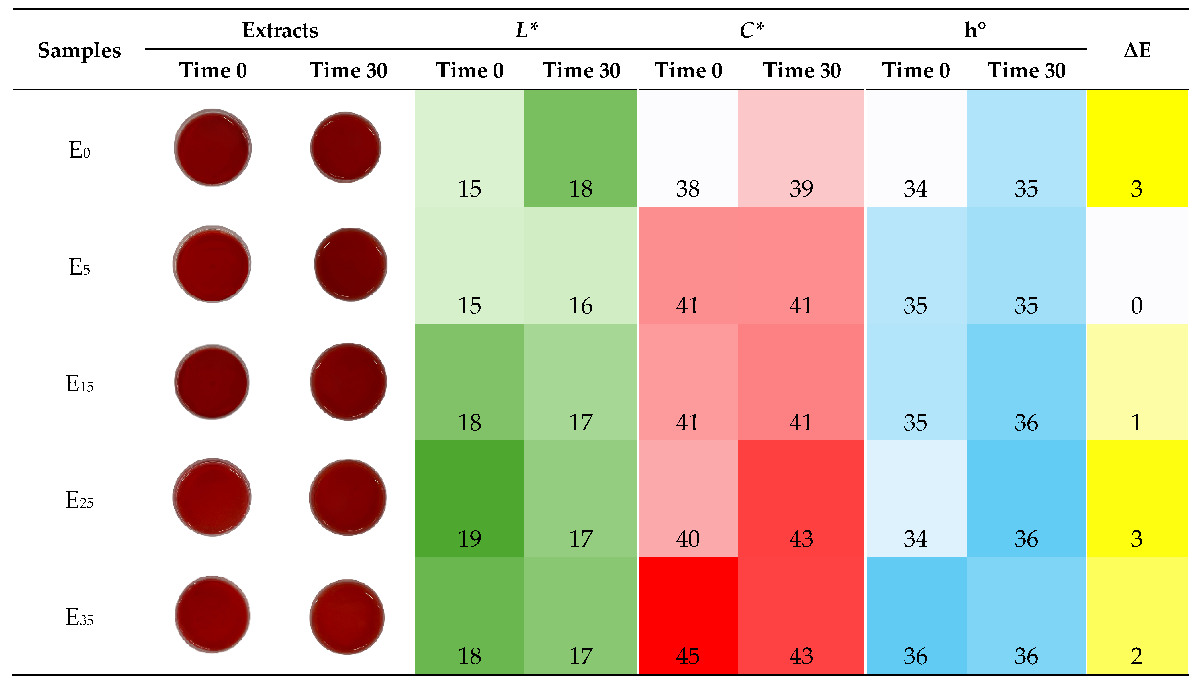 | Hue angle (h°) | 22.91 ± 0.50 | 24.16 ± 1.37 * |