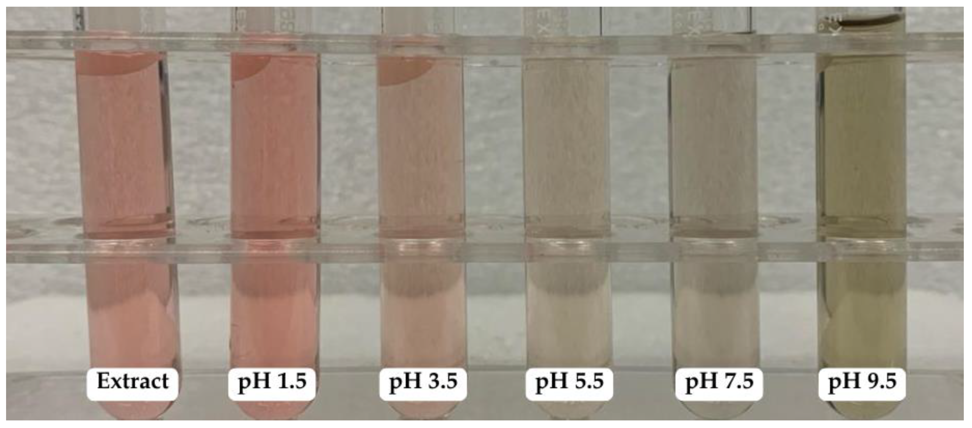 3.4. Chromatic Characterization of Extracts in Model Buffer Systems and Food Matrices