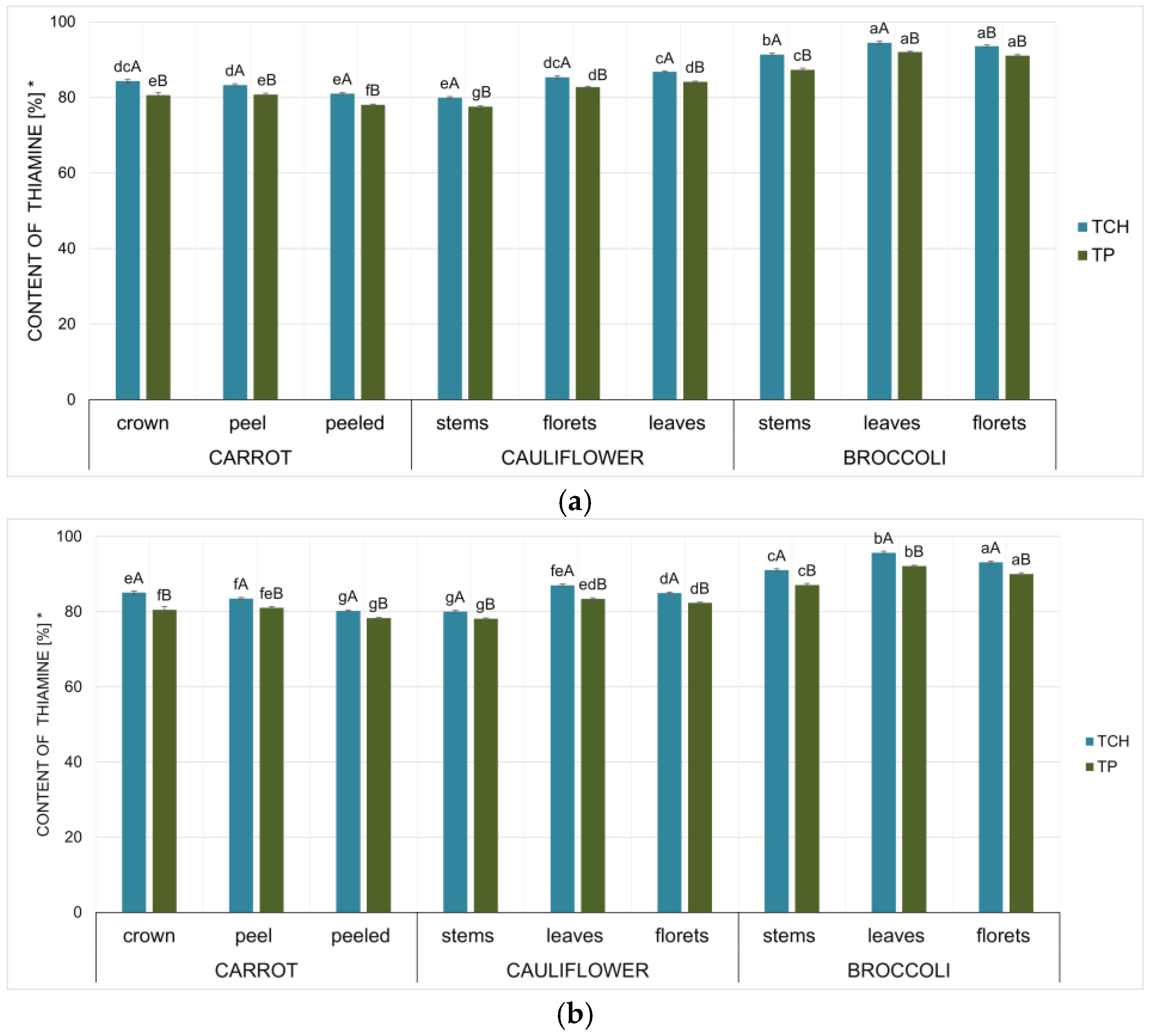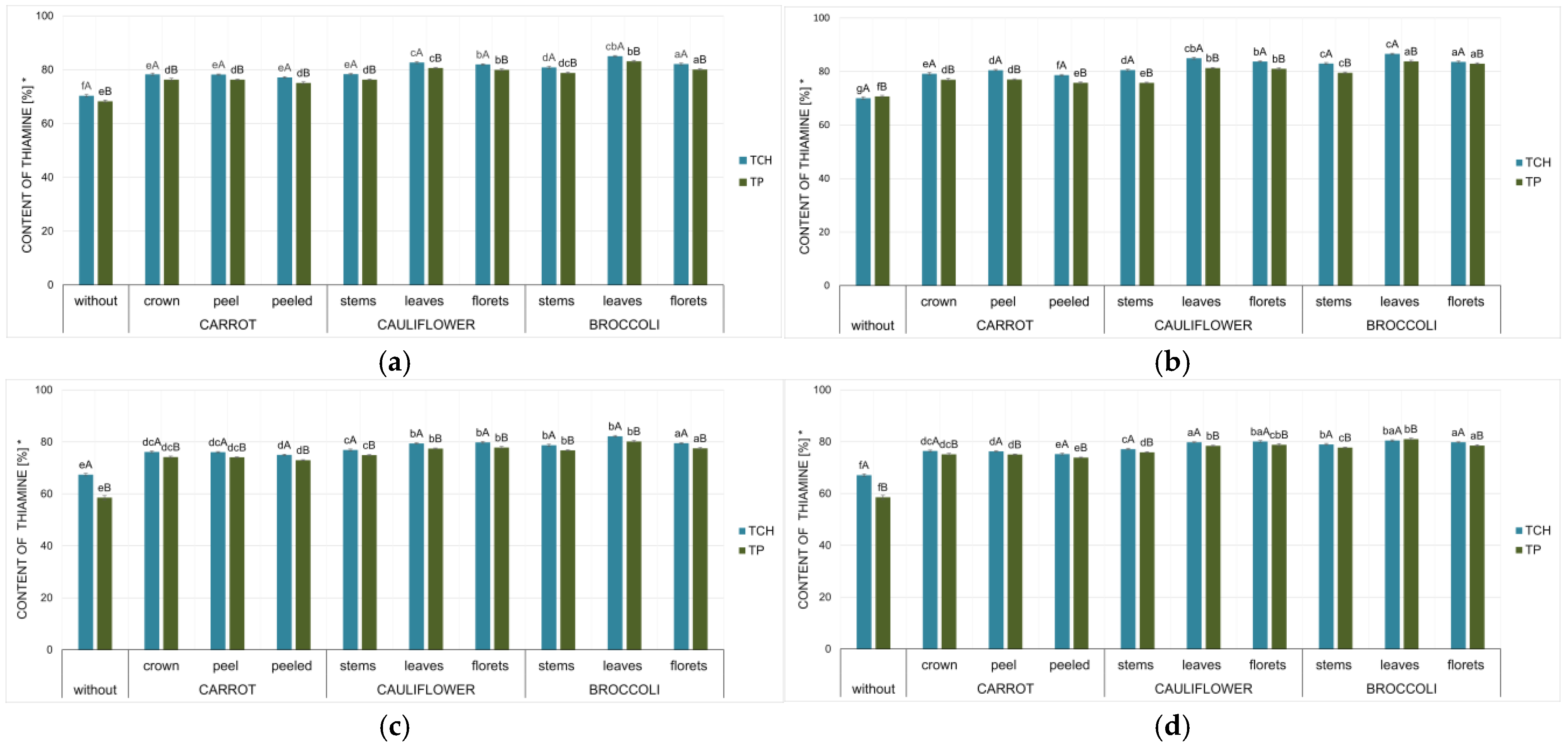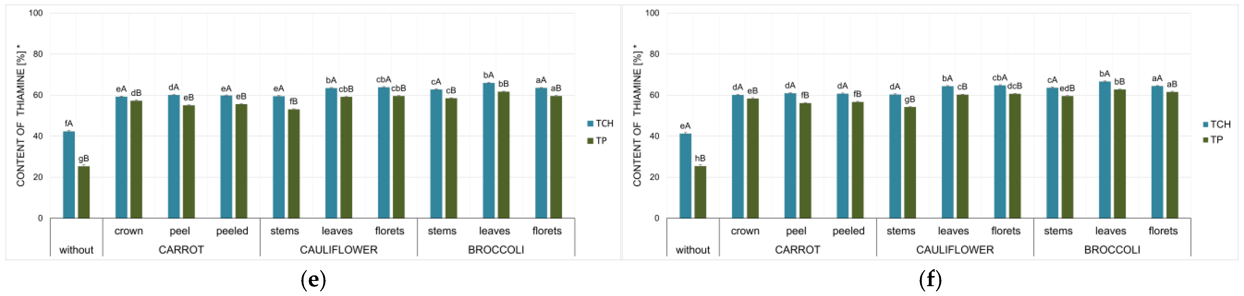 - Szymandera-Buszka, K.; Piechocka, J.; Zaremba, A.; Przeor, M.; Jędrusek-Golińska, A. Pumpkin, Cauliflower and Broccoli as New Carriers of Thiamine Compounds for Food Fortification. Foods 2021, 10, 578. [Google Scholar] [CrossRef]