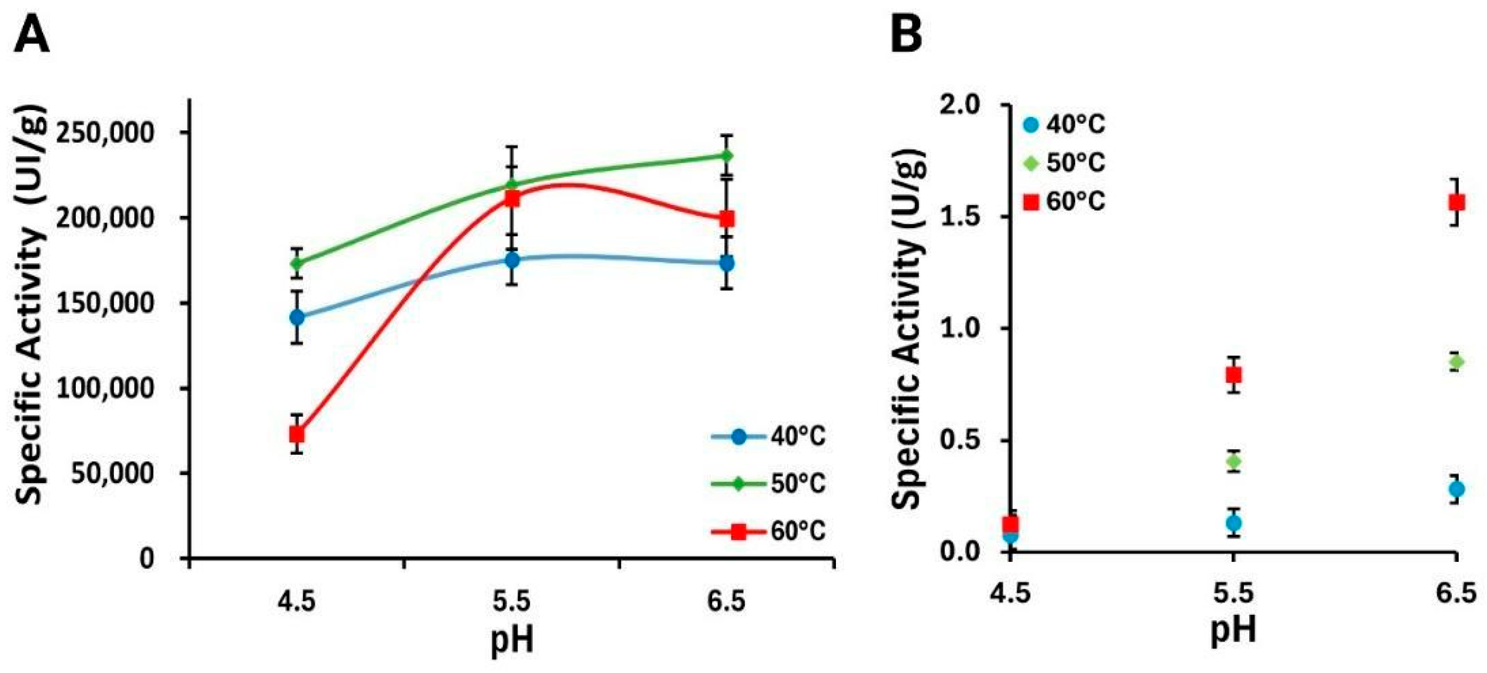| Optimal conditions | pH 5.3 and 51 °C | pH 6.5 and 60 °C | pH 6 and 59.5 °C | ||
