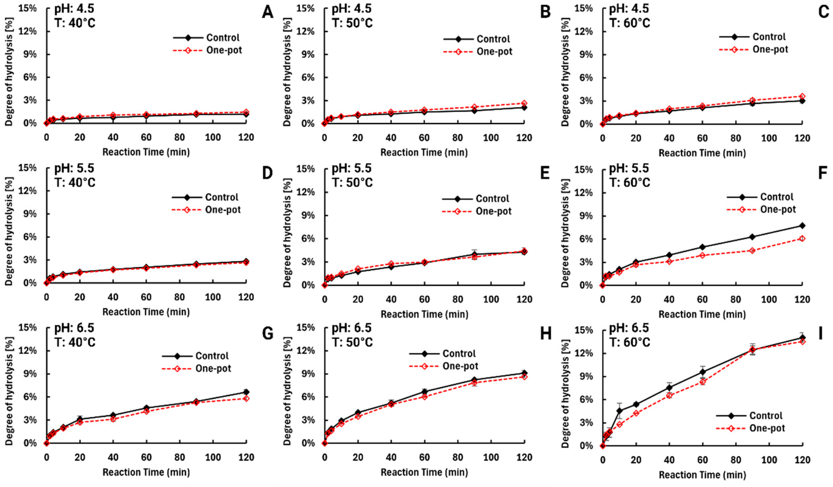 3.2. Effect of pH and Temperature on Protein Hydrolysis