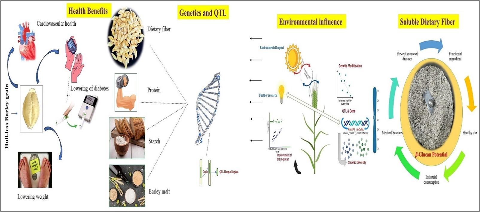 - Functional Food Development: the future of HB bioactives lies in the development of functional foods and dietary supplements. Bioactive compounds, such as β-glucan and antioxidants, have demonstrated potential in reducing the risk of chronic diseases, like type 2 diabetes, cardiovascular disease, and obesity. Future research should focus on enhancing the bioactive potential of HB through targeted genetic breeding programs. Specifically, efforts should aim at increasing β-glucan content, improving antioxidant levels, and exploring barley’s potential in diverse functional food products, such as barley-based snacks and beverages that combine health benefits with consumer convenience.