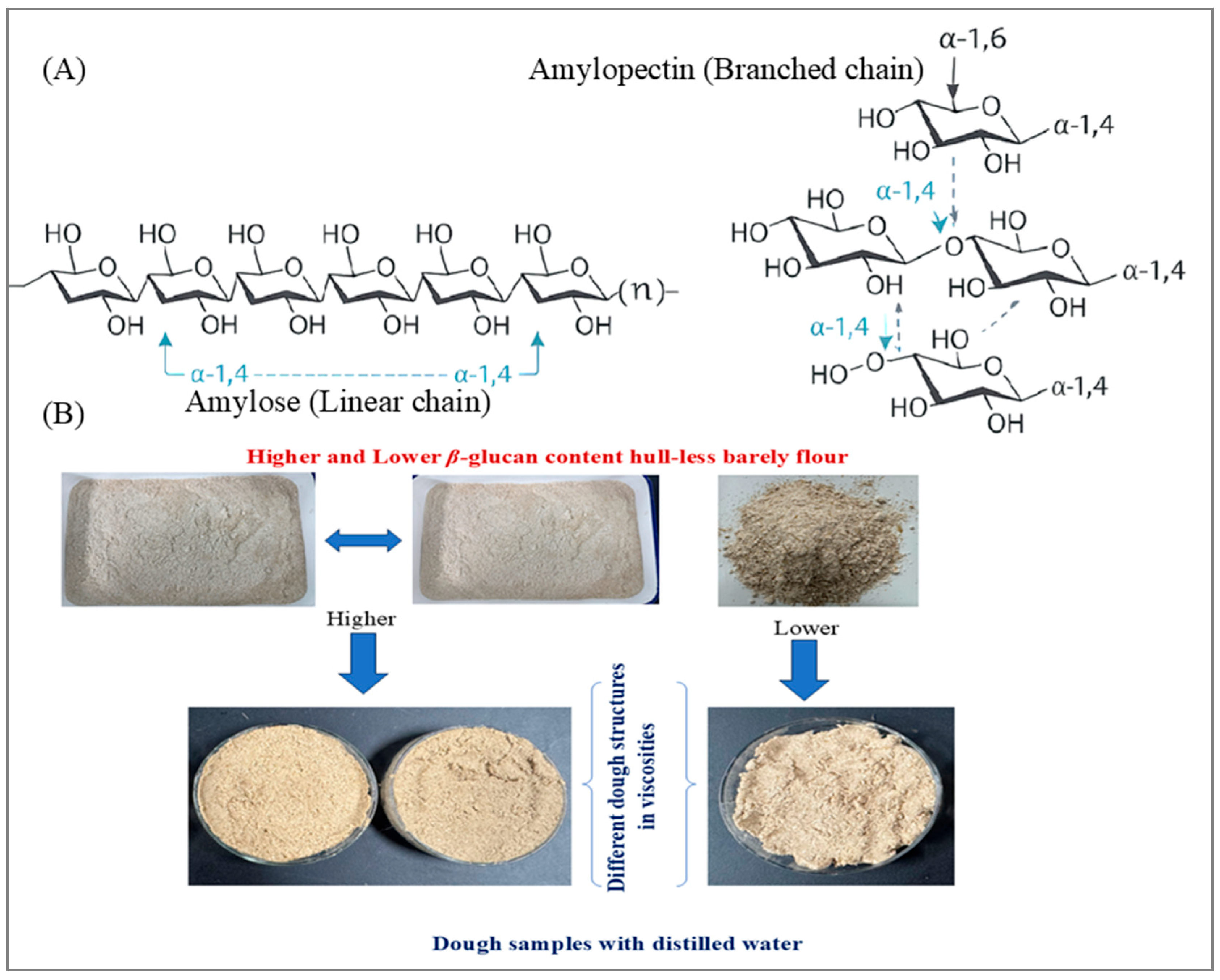 - Barley Starch Optimization for Health and Functional Foods: the ratio of amylose to amylopectin in barley starch plays a key role in the formation of RS, which has significant health benefits, such as glycemic control and gut health improvement. Future studies should focus on optimizing the amylose/amylopectin ratio in barley through breeding or genetic modification. Additionally, research should explore how the incorporation of RS into barley-based foods can enhance their texture and sensory properties, providing new opportunities for functional food development.