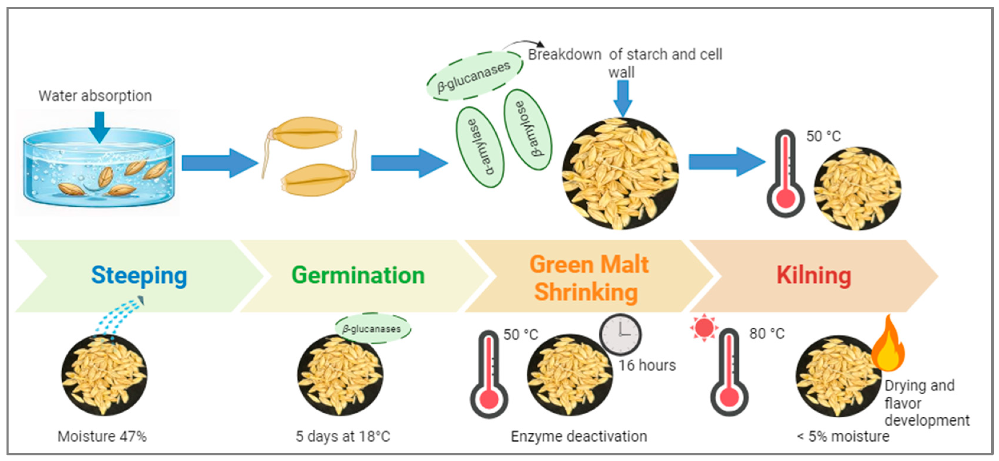 - Habschied, K.; Lalić, A.; Horvat, D.; Mastanjević, K.; Lukinac, J.; Jukić, M.; Krstanović, V. β-Glucan Degradation During Malting of Different Purpose Barley Varieties. Fermentation 2020, 6, 21. [Google Scholar] [CrossRef]