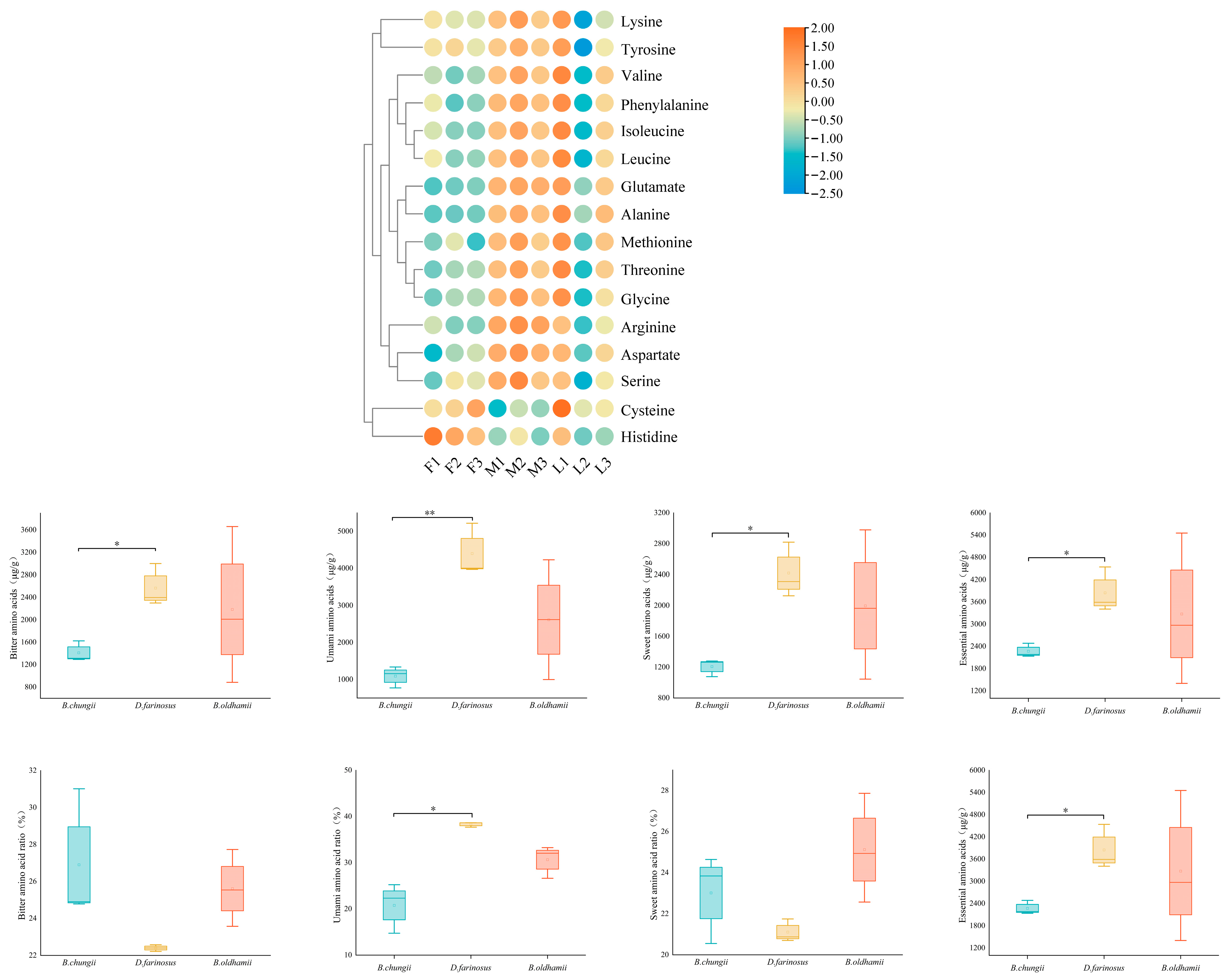 | D. farinosus | Bitterness | 9.64 ± 0.38 a | 4.00 ± 0.54 b | 2.29 ± 0.65 d | 4.50 ± 1.21 b | 3.00 ± 0.73 c | 2.00 ± 0.75 de | 2.57 ± 0.62 cd | 3.95 ± 0.54 b | 1.48 ± 0.41 e |