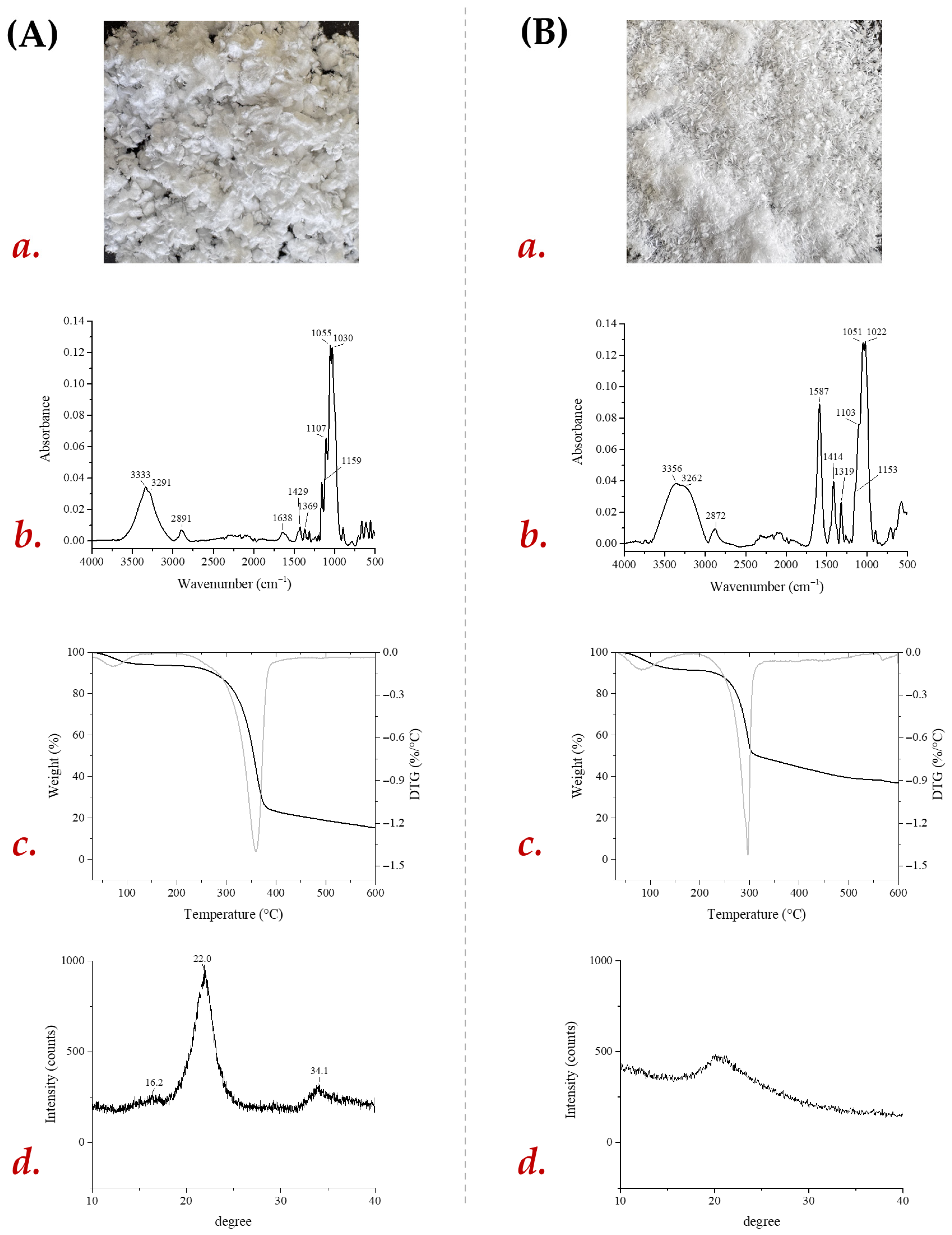 3.3. Structural Characterization of THR-Cellulose and Derived CMC