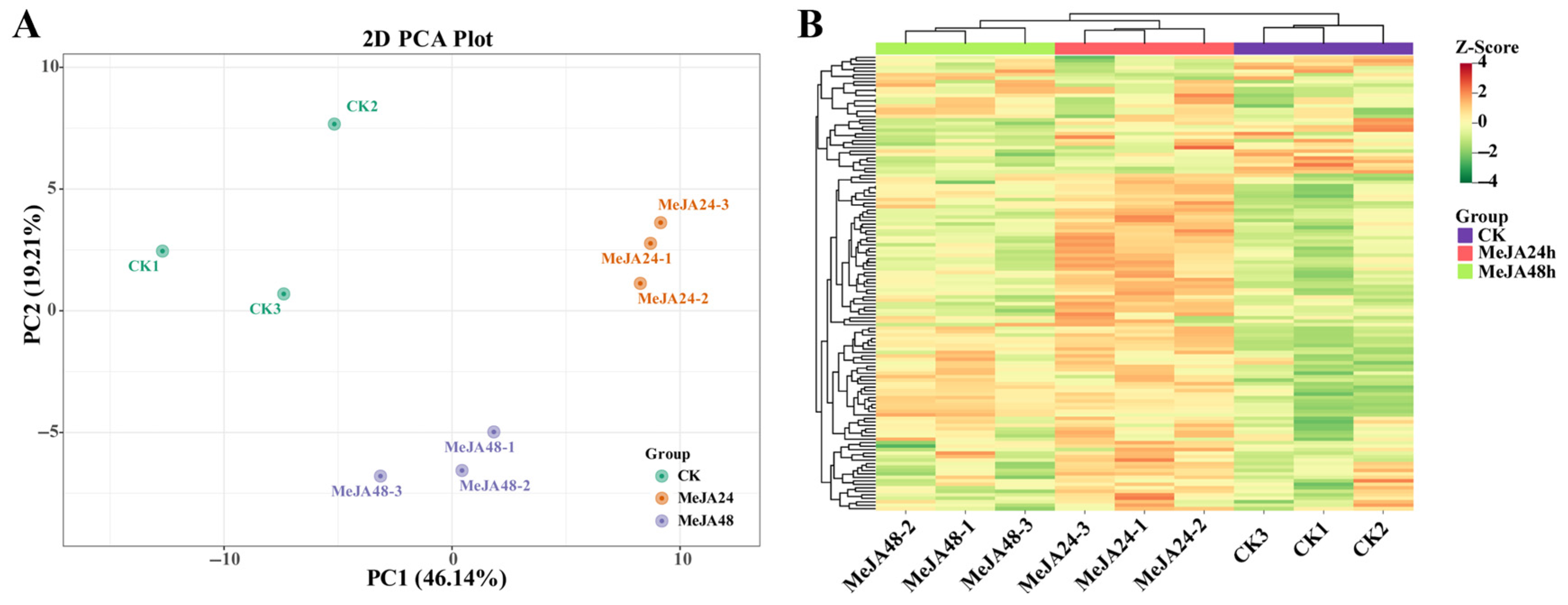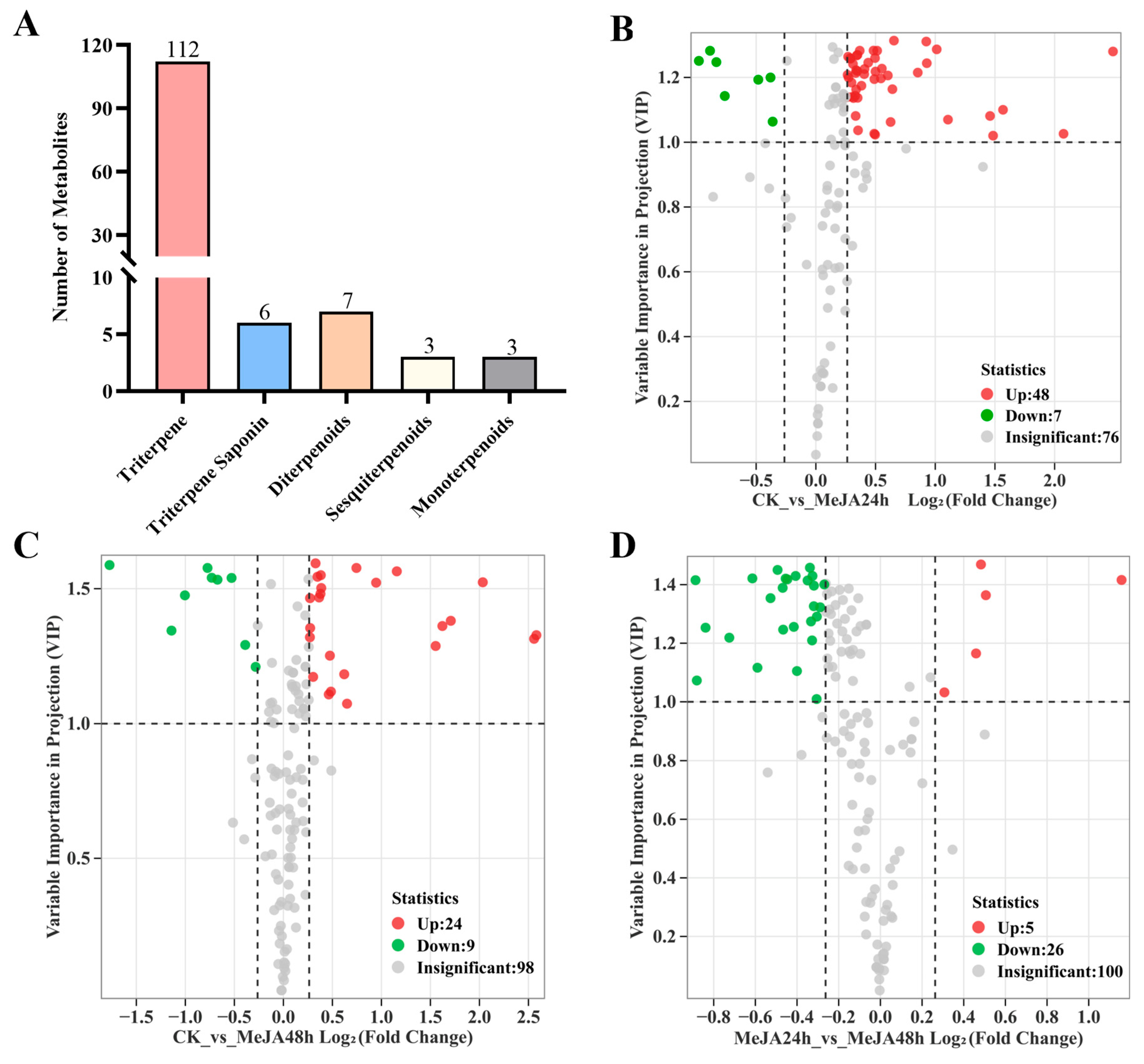 3.1. Widely Targeted Terpeneoid Profiling of Loquat Callus Under MeJA Treatment