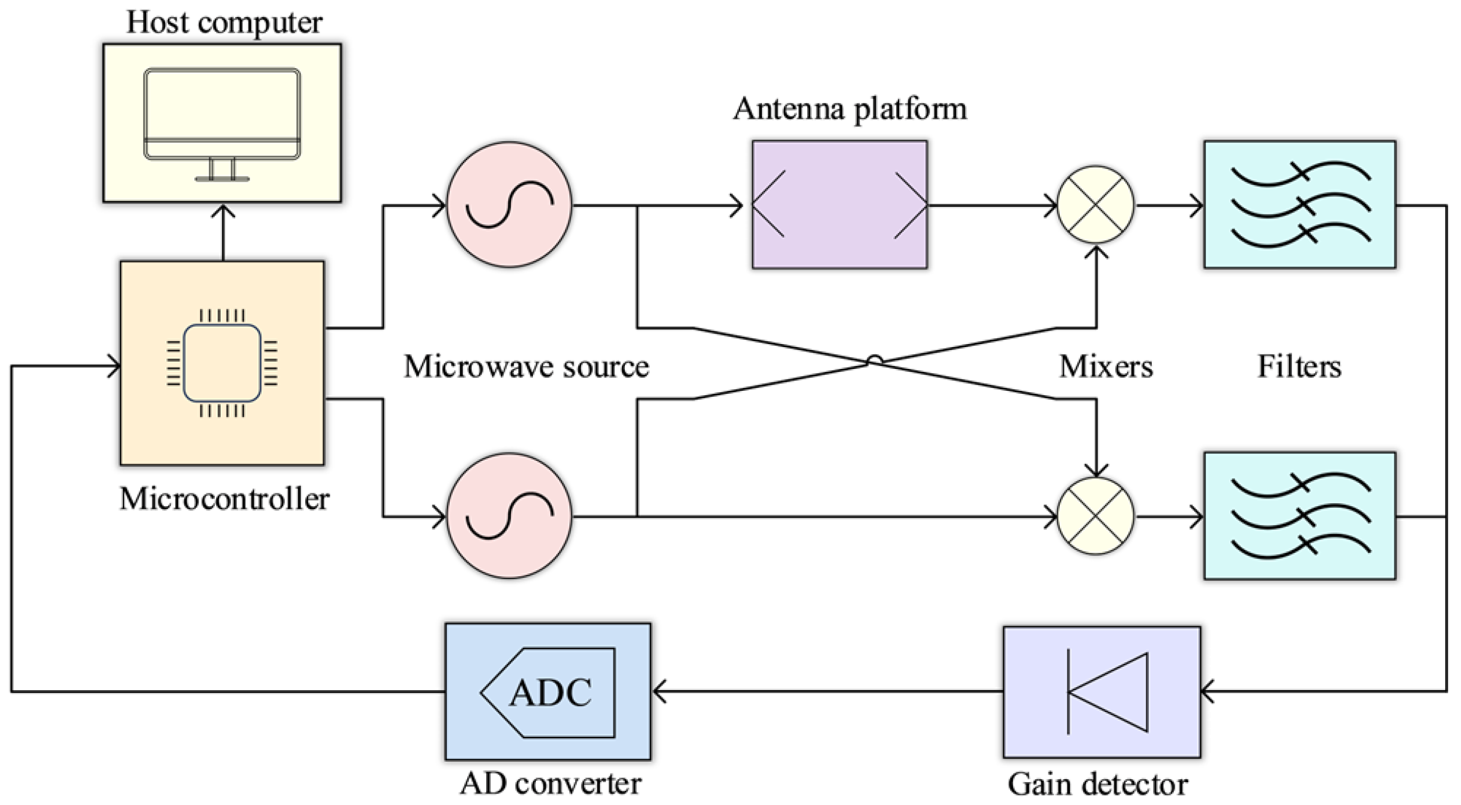 To extract the sample-induced response, the transmitted swept signal was mixed with the fixed-frequency reference signal and compared against a baseline signal acquired under empty (no-sample) conditions. The resulting amplitude and phase information was converted into voltage outputs by an amplitude/phase detector chip. The voltage signals were digitized by an analog-to-digital converter (ADC) and sent to the STM32 microcontroller, then transferred via serial communication to a host computer for visualization (imaging), storage, and subsequent analysis.
