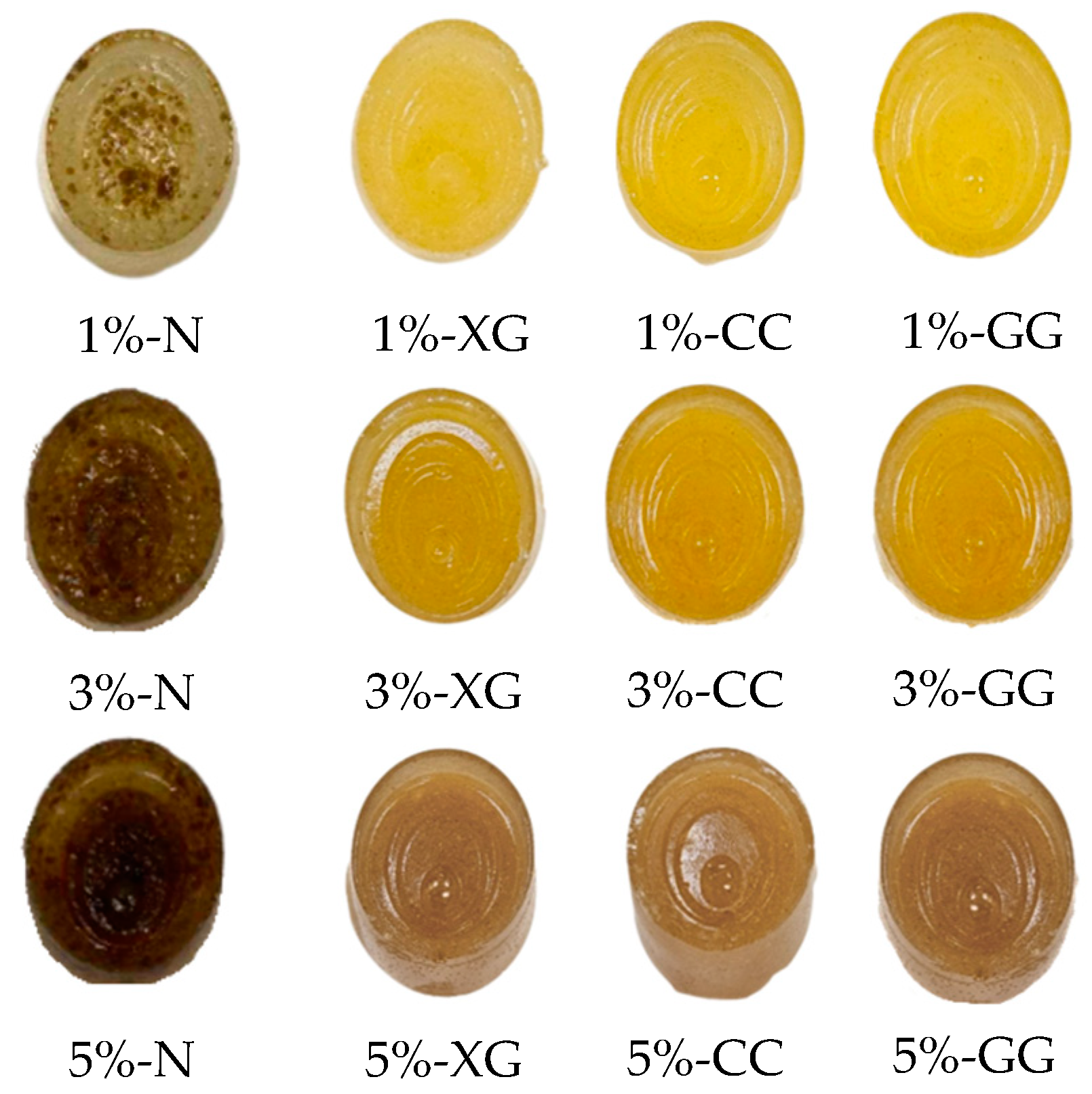 - Renaldi, G.; Junsara, K.; Jannu, T.; Sirinupong, N.; Samakradhamrongthai, R.S. Physicochemical, Textural, and Sensory Qualities of Pectin/Gelatin Gummy Jelly Incorporated with Garcinia Atroviridis and Its Consumer Acceptability. Int. J. Gastron. Food Sci. 2022, 28, 100505. [Google Scholar] [CrossRef]