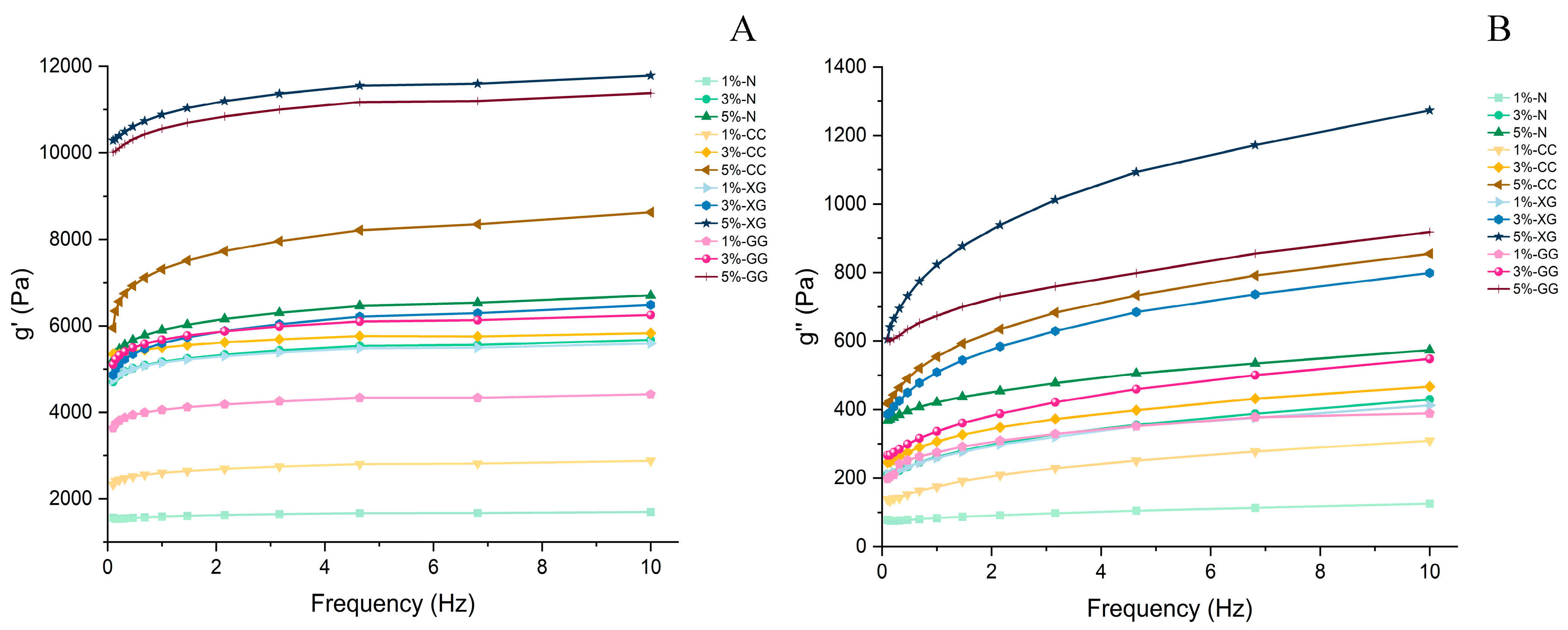 - Zhong, Y.; Zeng, S.; Lv, Y.; Lv, W.; Xiao, H.; Sheng, S. Effect of Guar Gum on the Rheological Properties, Microstructure and 3D Printing Performance of Egg Yolk Powder-Potato Starch Composite Gel. Food Hydrocoll. 2024, 153, 110018. [Google Scholar] [CrossRef]