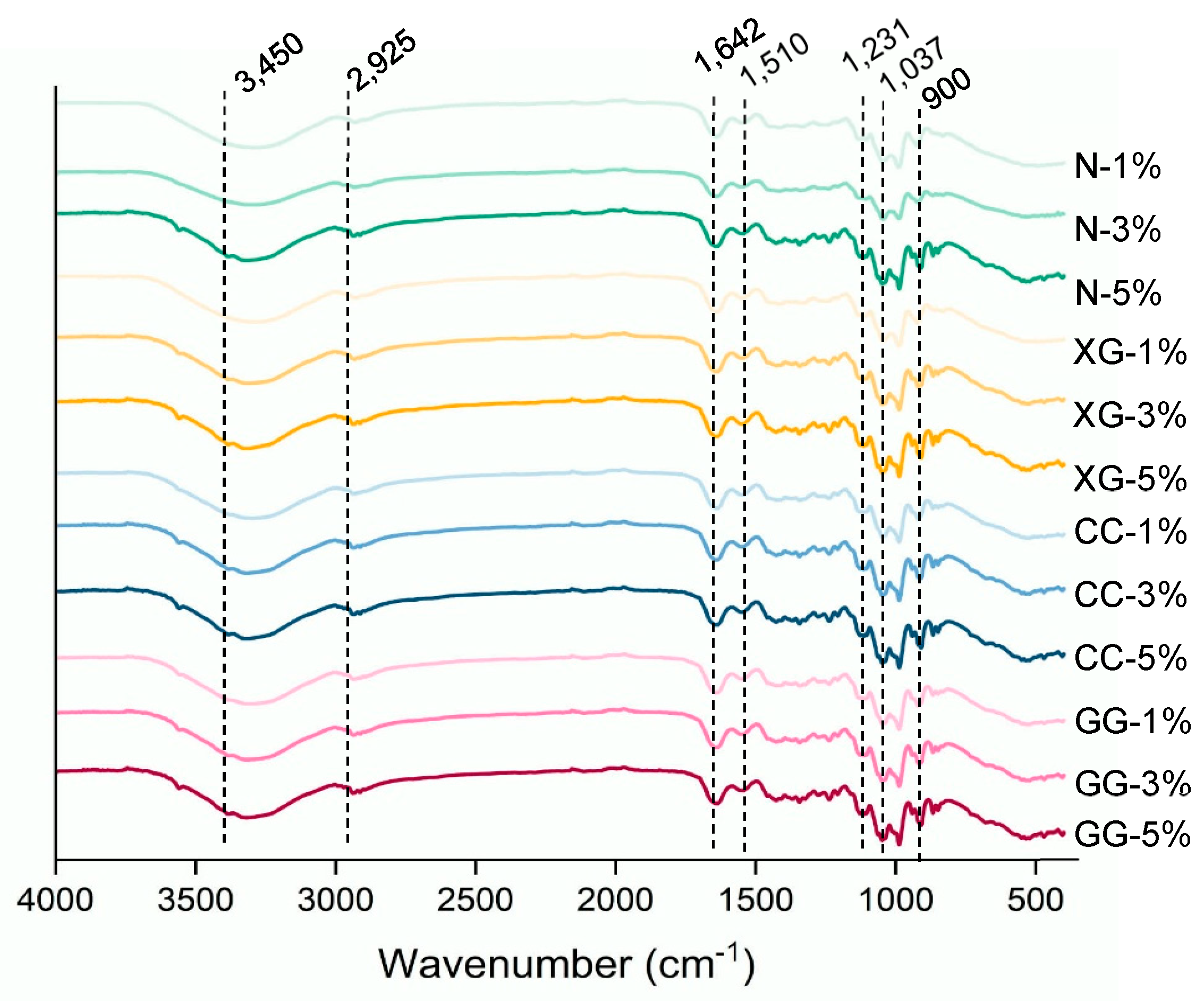 | GHDF | Hydrocolloids | Moisture | Proteins | Carbohydrate | Fiber | Lipids ns | Ash |