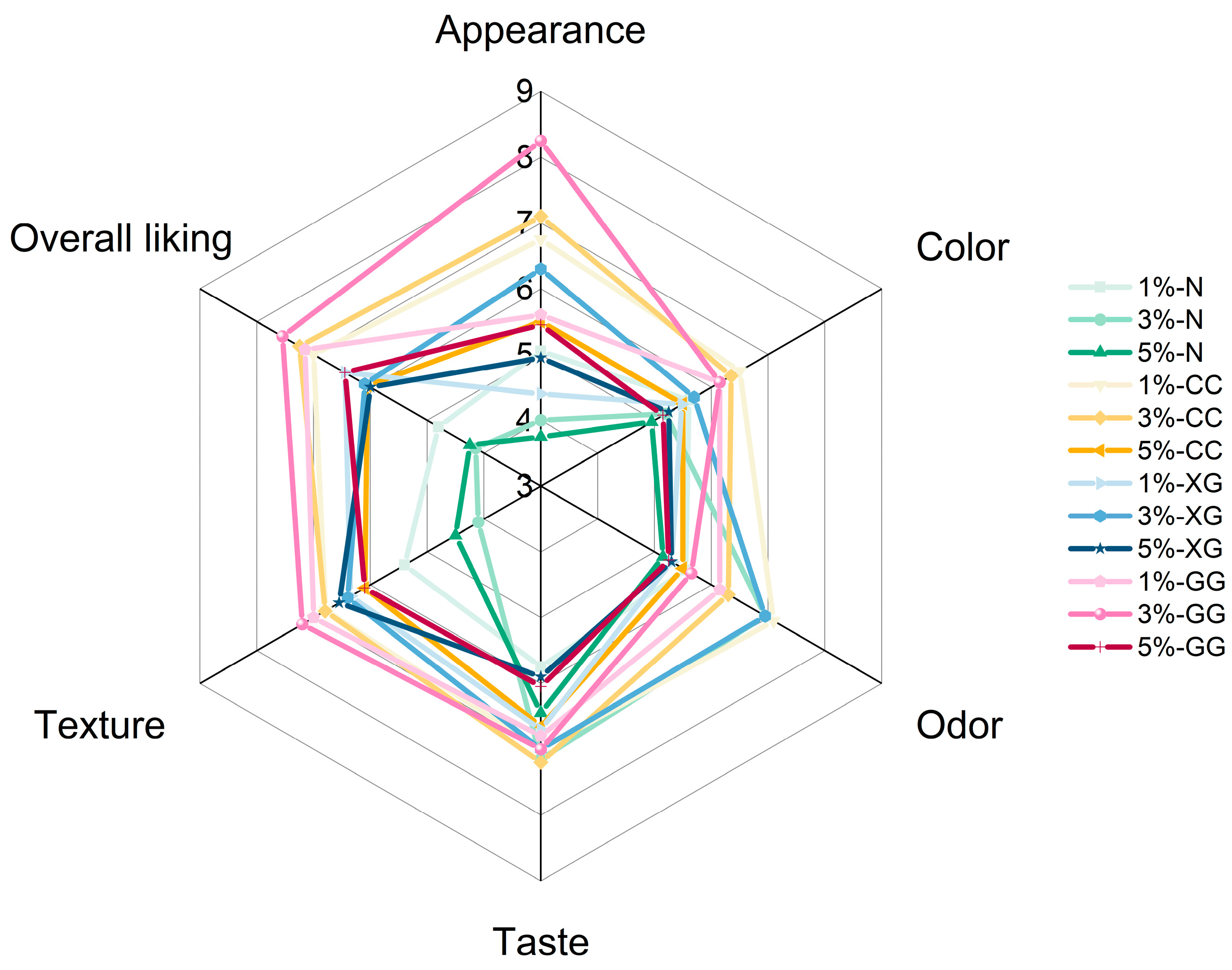 - Lin, H.-T.V.; Tsai, J.-S.; Liao, H.-H.; Sung, W.-C. Effect of Hydrocolloids on Penetration Tests, Sensory Evaluation, and Syneresis of Milk Pudding. Polymers 2025, 17, 300. [Google Scholar] [CrossRef]