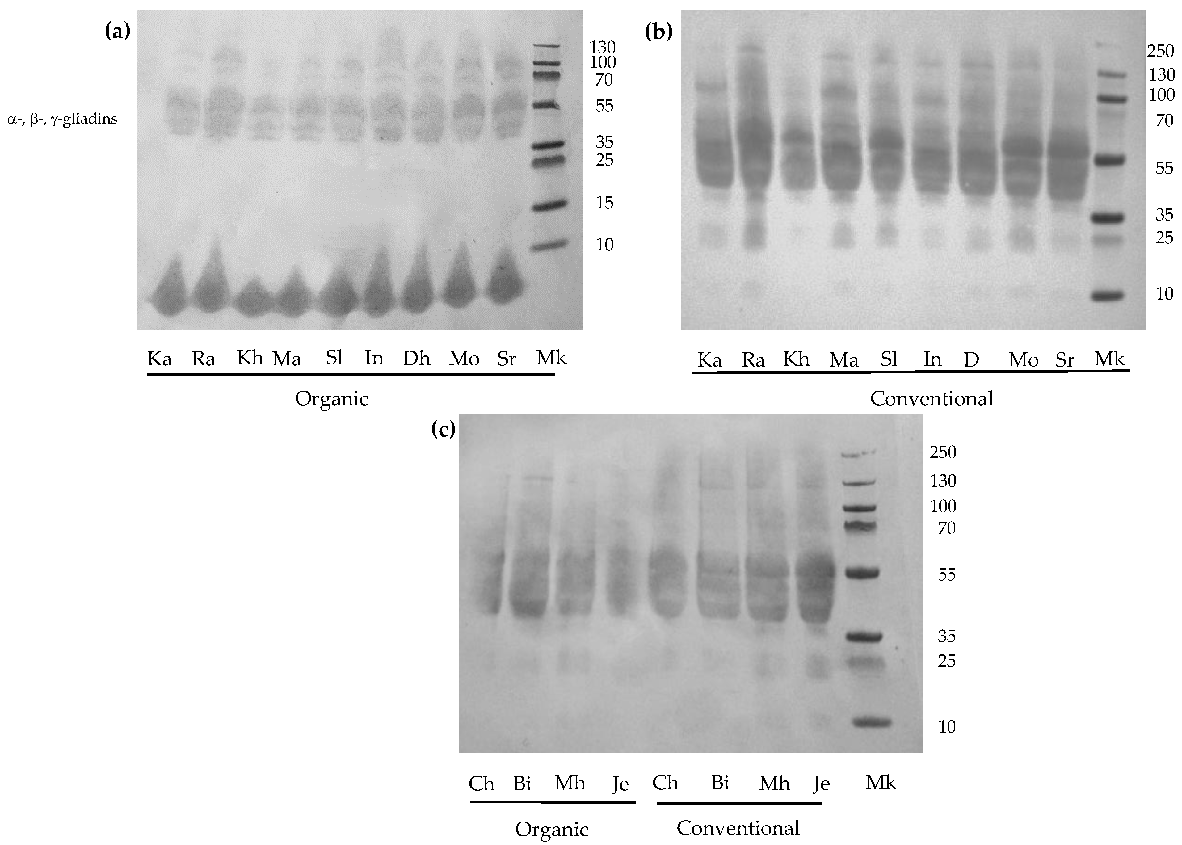 3.6. Protein Profile and Immunoreactivity of Wheat Varieties