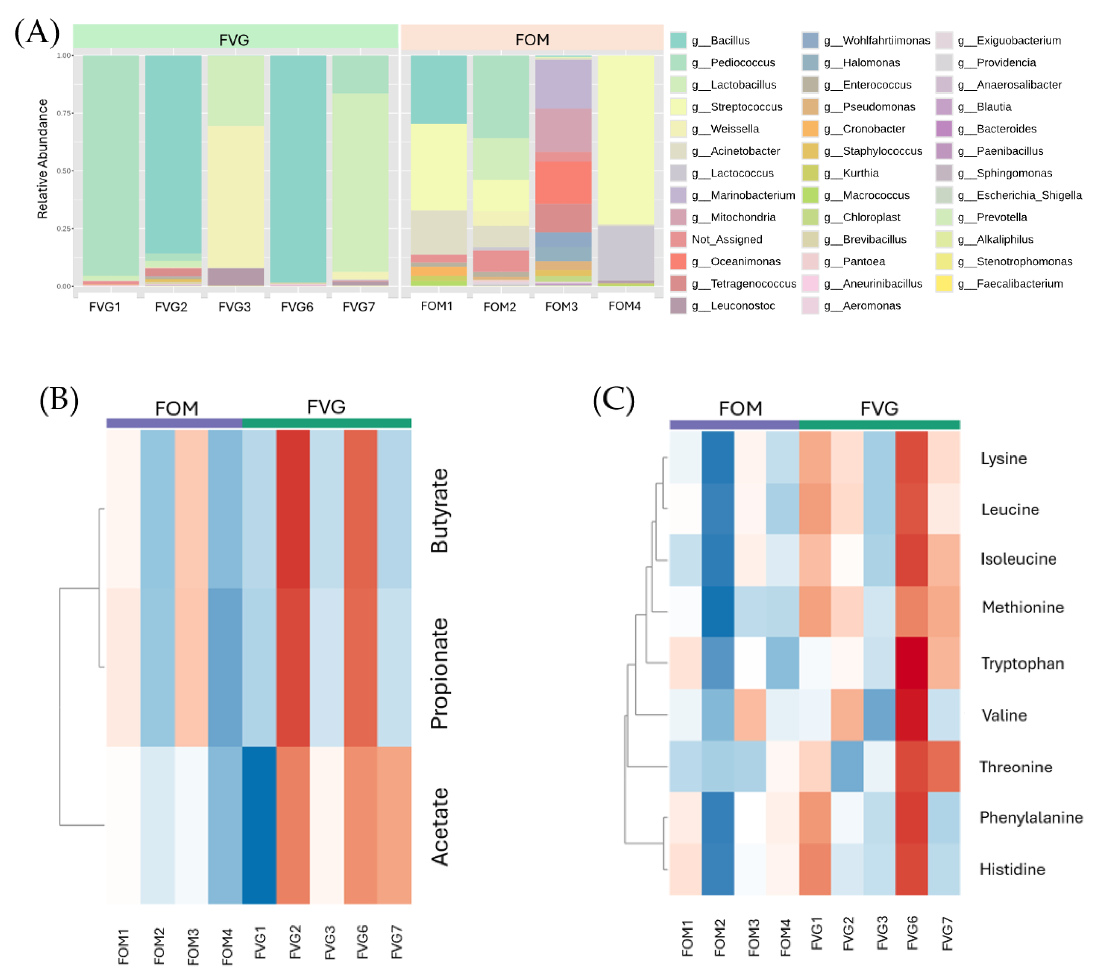 | Genera Bacterial | Average of VG Gut Bacterial Microbiota (%) | Average of FVG Bacterial Communities (%) | Average of OM Gut Bacterial Microbiota (%) | Average of FOM Bacterial Communities (%) |