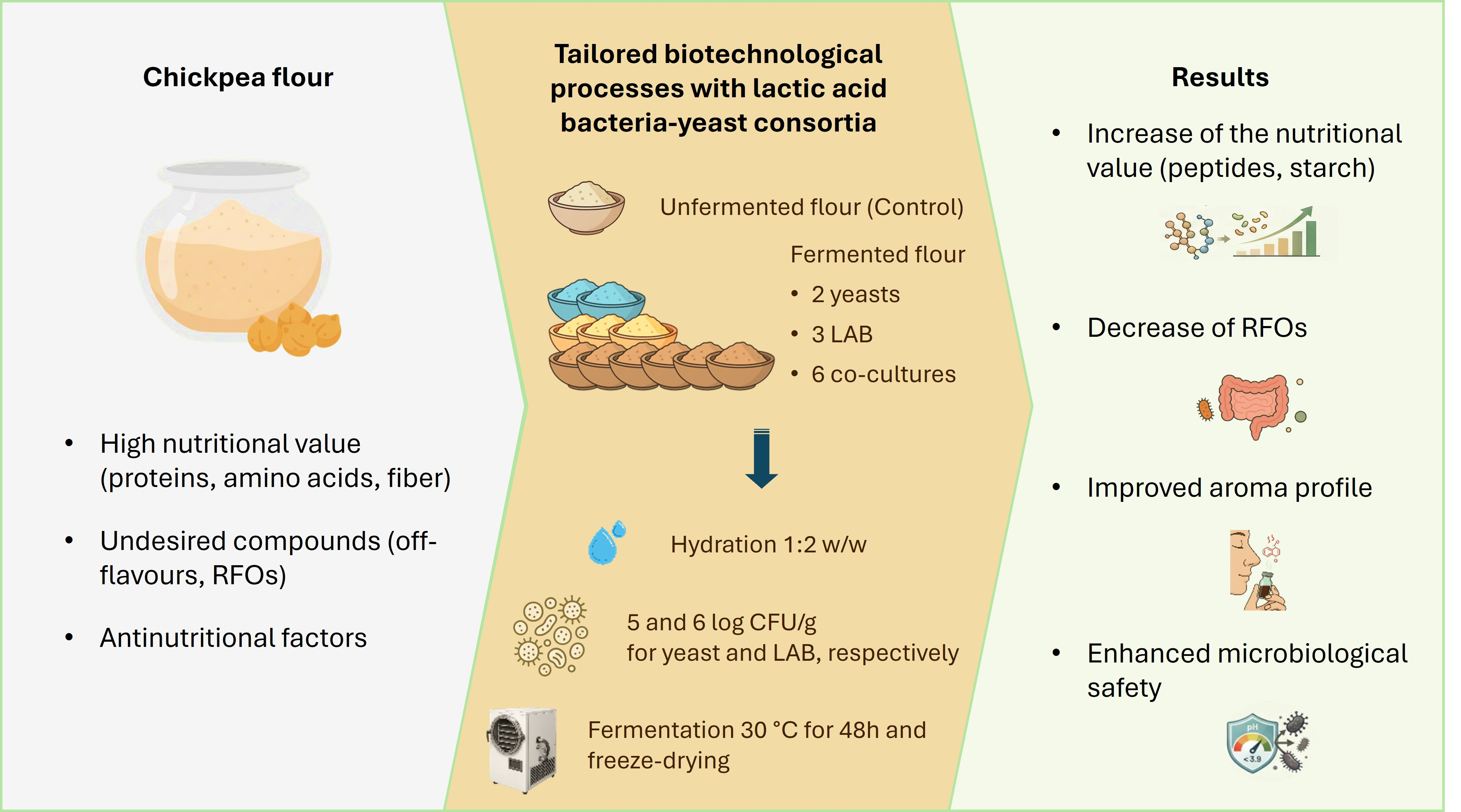 Amadei S, Gottardi D, Sindaco M, Gandolfi I, D’Alessandro M, Pellegrino L, Di Nunzio M, Siroli L, Patrignani F, Lanciotti R. Lactic Acid Bacteria–Yeast Consortia Enhance Nutritional Quality, Safety, and Volatilome of Fermented Chickpea Flour. Foods. 2026; 15(7):1239. https://doi.org/10.3390/foods15071239