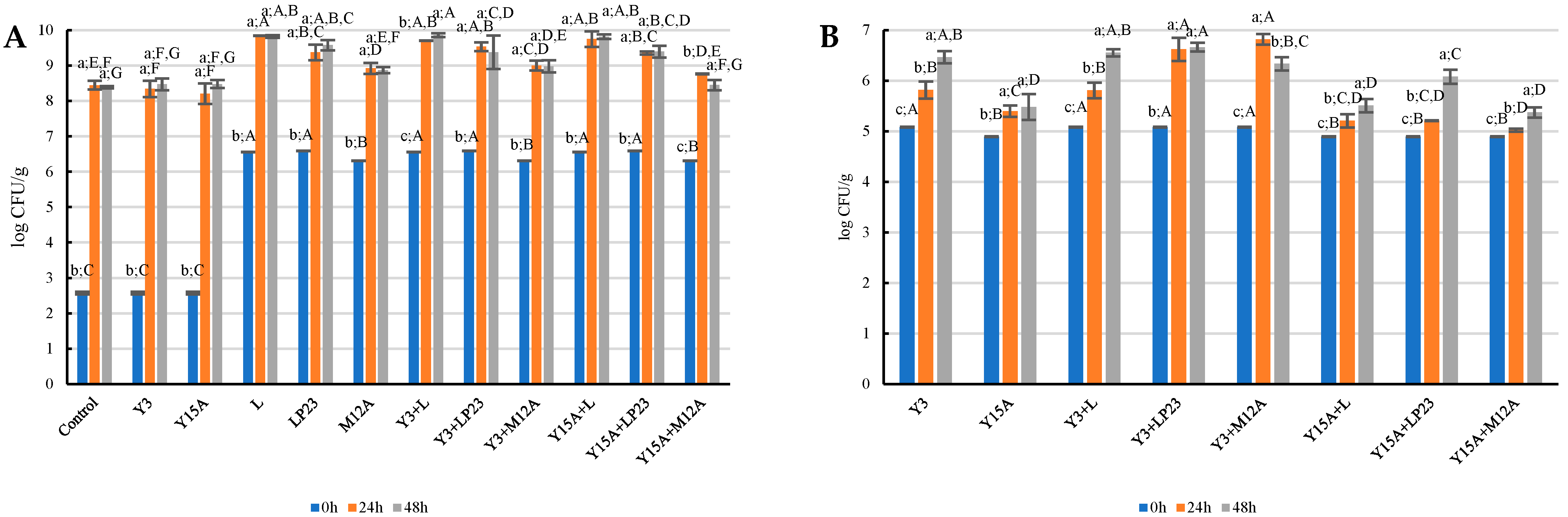 | Y3+M12A | 6.39 ± 0.02 a | 4.43 ± 0.01 b;E | 4.32 ± 0.02 c;B |