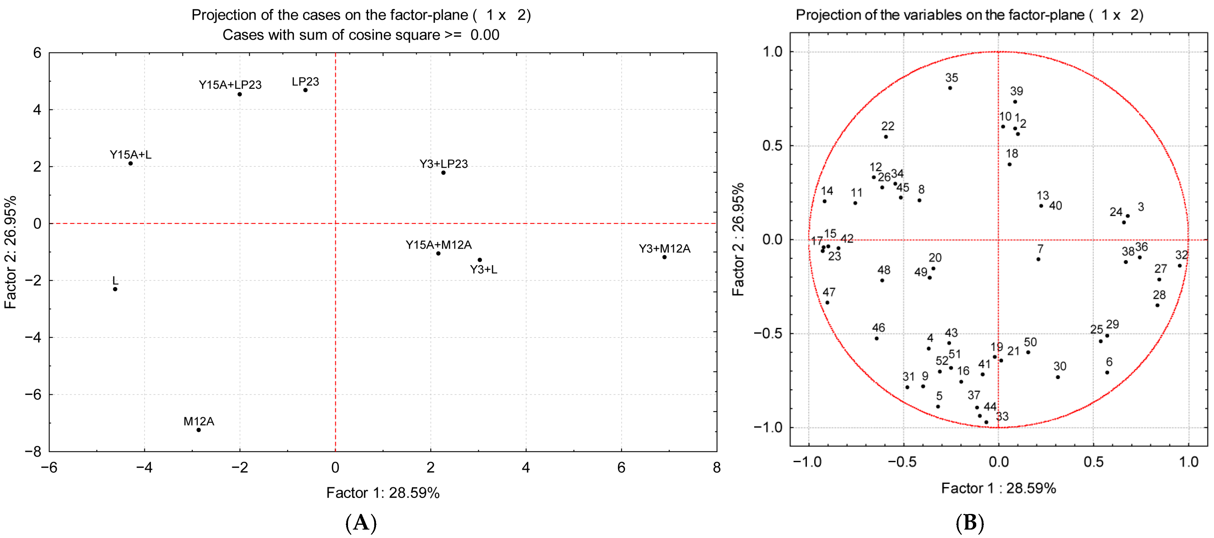 | Y15A+M12A | 6.39 ± 0.02 a | 4.30 ± 0.01 b;G | 4.16 ± 0.01 c;C |