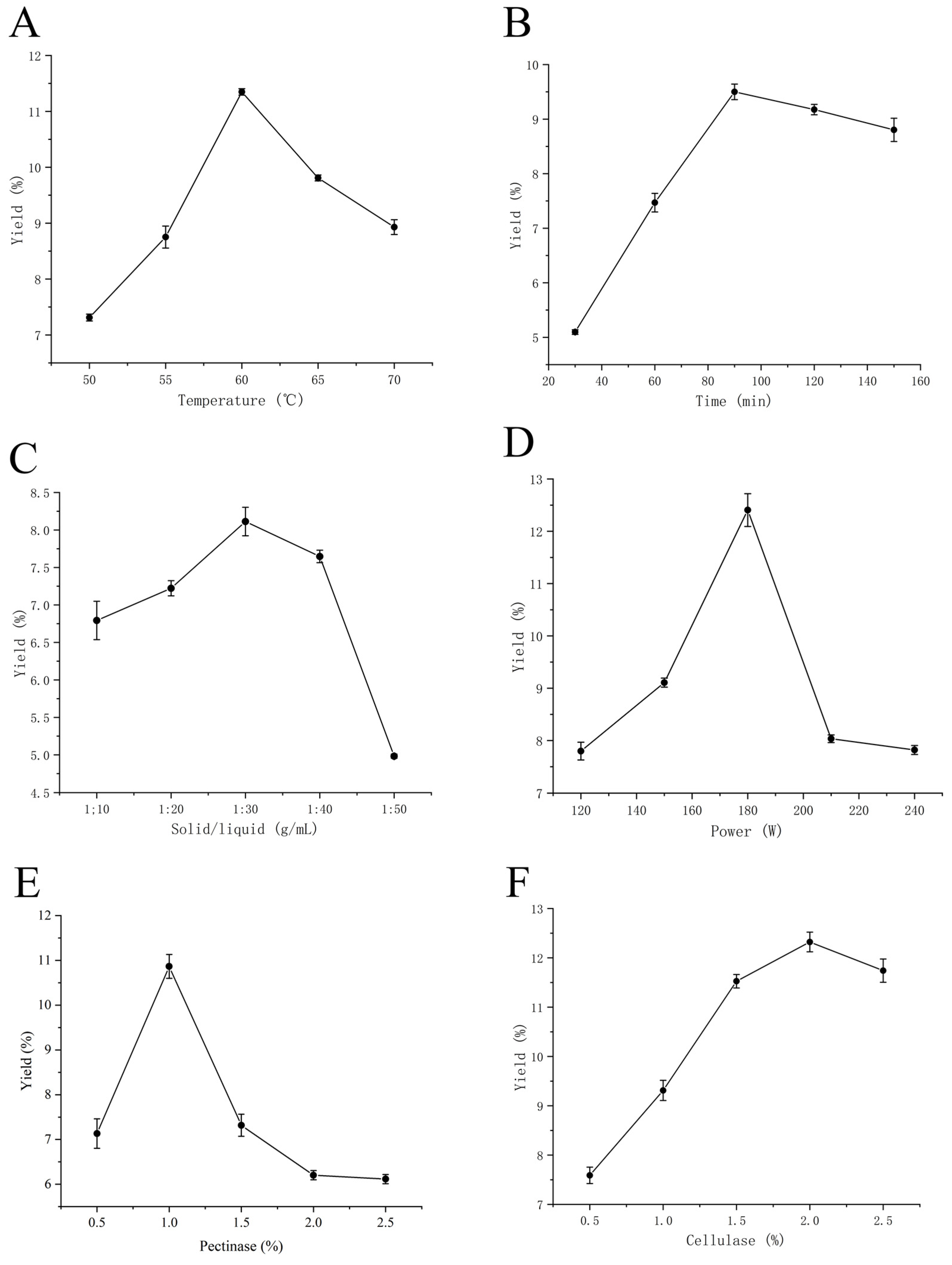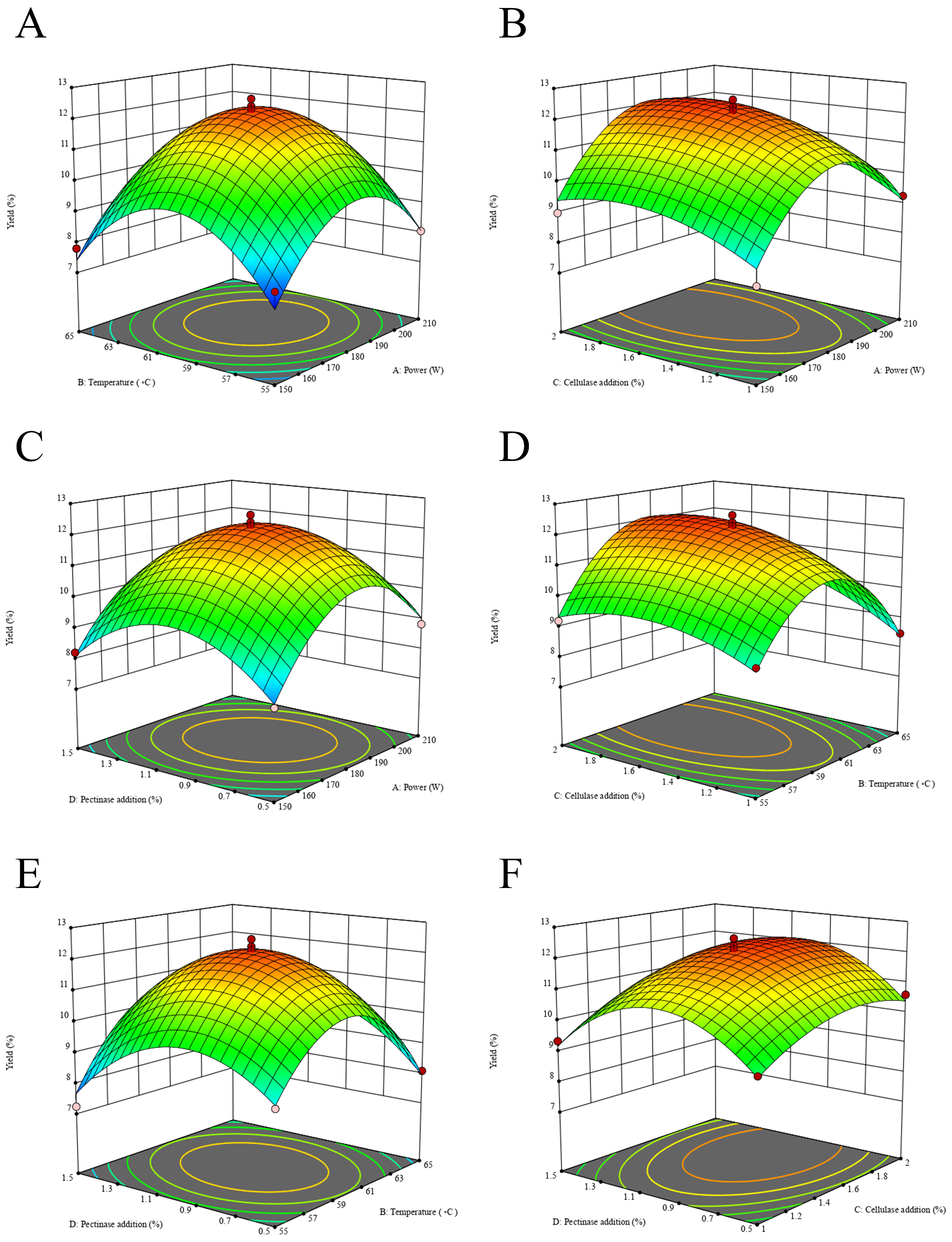 | Run | Power (W) | Temperature (°C) | Cellulase (%) | Pectinase (%) | Yield (%) |