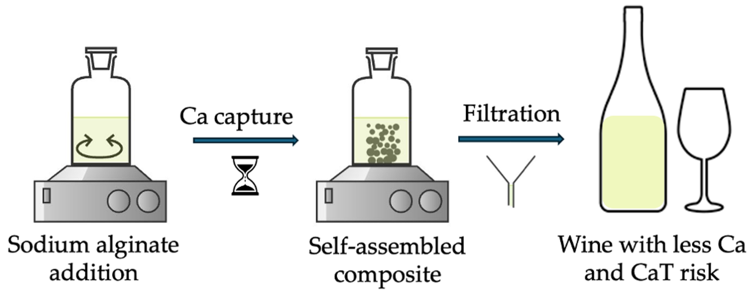 - Cosme, F.; Filipe-Ribeiro, L.; Coixao, A.; Bezerra, M.; Nunes, F.M. Efficiency of Alginic Acid, Sodium Carboxymethylcellulose, and Potassium Polyaspartate as Calcium Tartrate Stabilizers in Wines. Foods 2024, 13, 1880. [Google Scholar] [CrossRef] [PubMed]