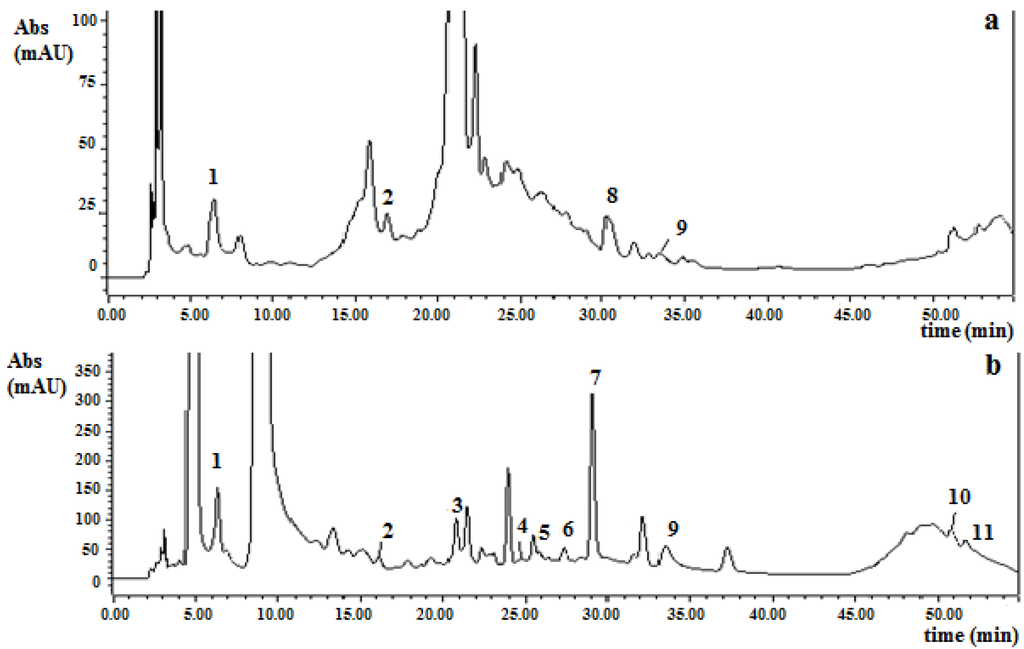 | Kaempferol | - | - | 0.09 ± 0.02 a | 0.62 ± 0.09 b |