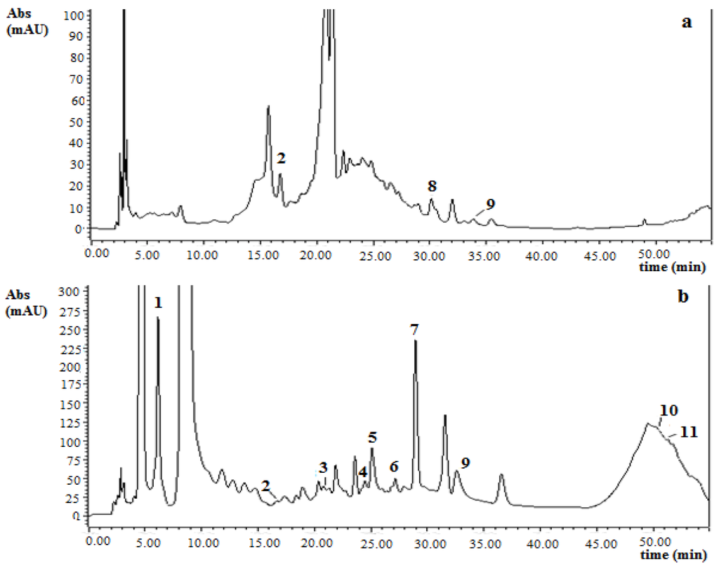 | Gallic acid | 1.36 ± 0.05 | - | 14.28 ± 1.35 a | 17.21 ± 1.30 b |