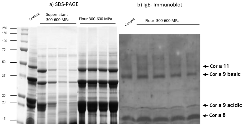 - Peñas, E.; Gomez, R.; Frias, J.; Baeza, M.L.; Vidal-Valverde, C. High hydrostatic pressure effects on immunoreactivity and nutritional quality of soybean products. Food Chem. 2011, 125, 423–429. [Google Scholar] [CrossRef]