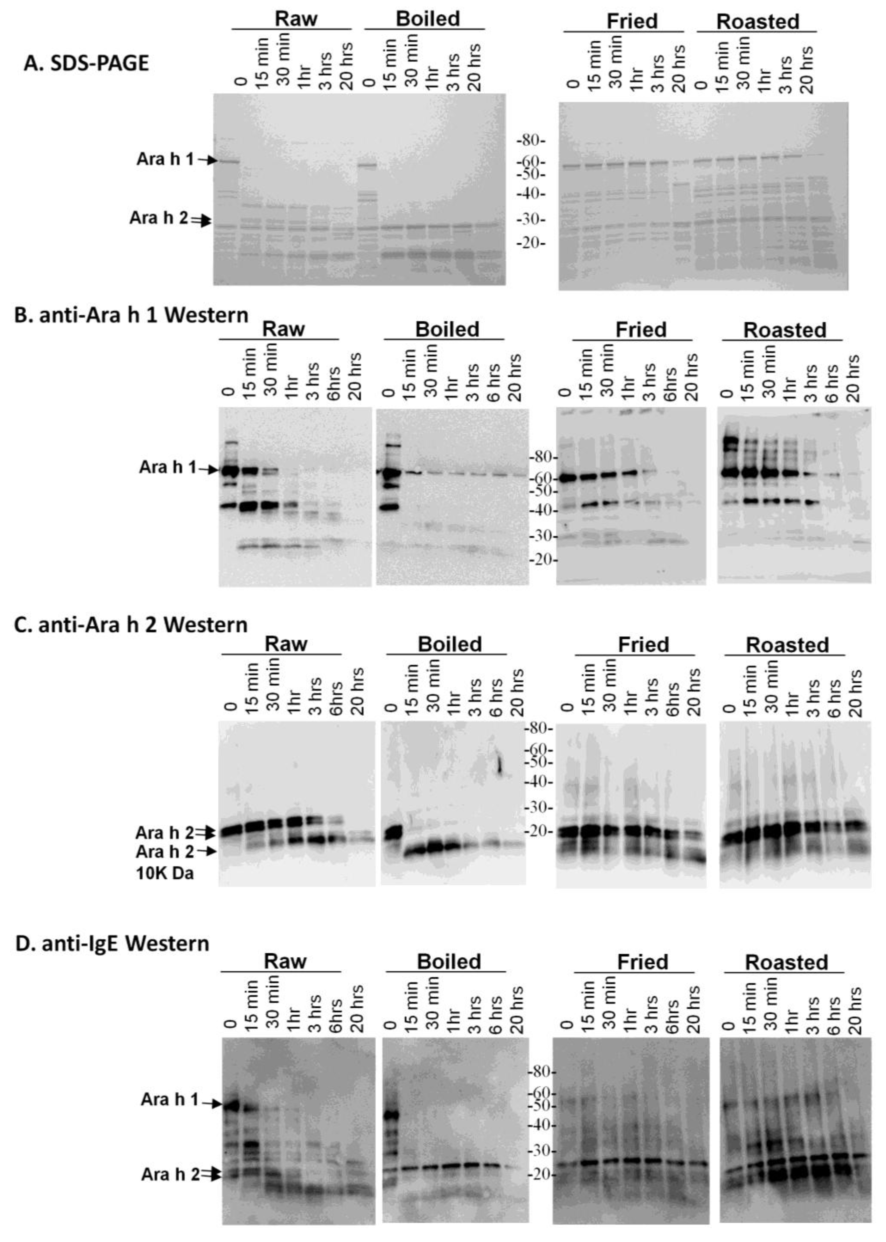 SDS-PAGE and western analysis of the digestion of raw, boiled, fried and roasted peanut extracts with pepsin. Soluble protein extracts from raw, boiled, fried and roasted peanuts were digested with pepsin and subjected to SDS-PAGE (A), western blot analysis with anti-Ara h 1 antibody (B), western blot analysis with anti-Ara h 2 antibody (C) and western blot analysis pooled human IgE sera from peanut allergic individuals (D).