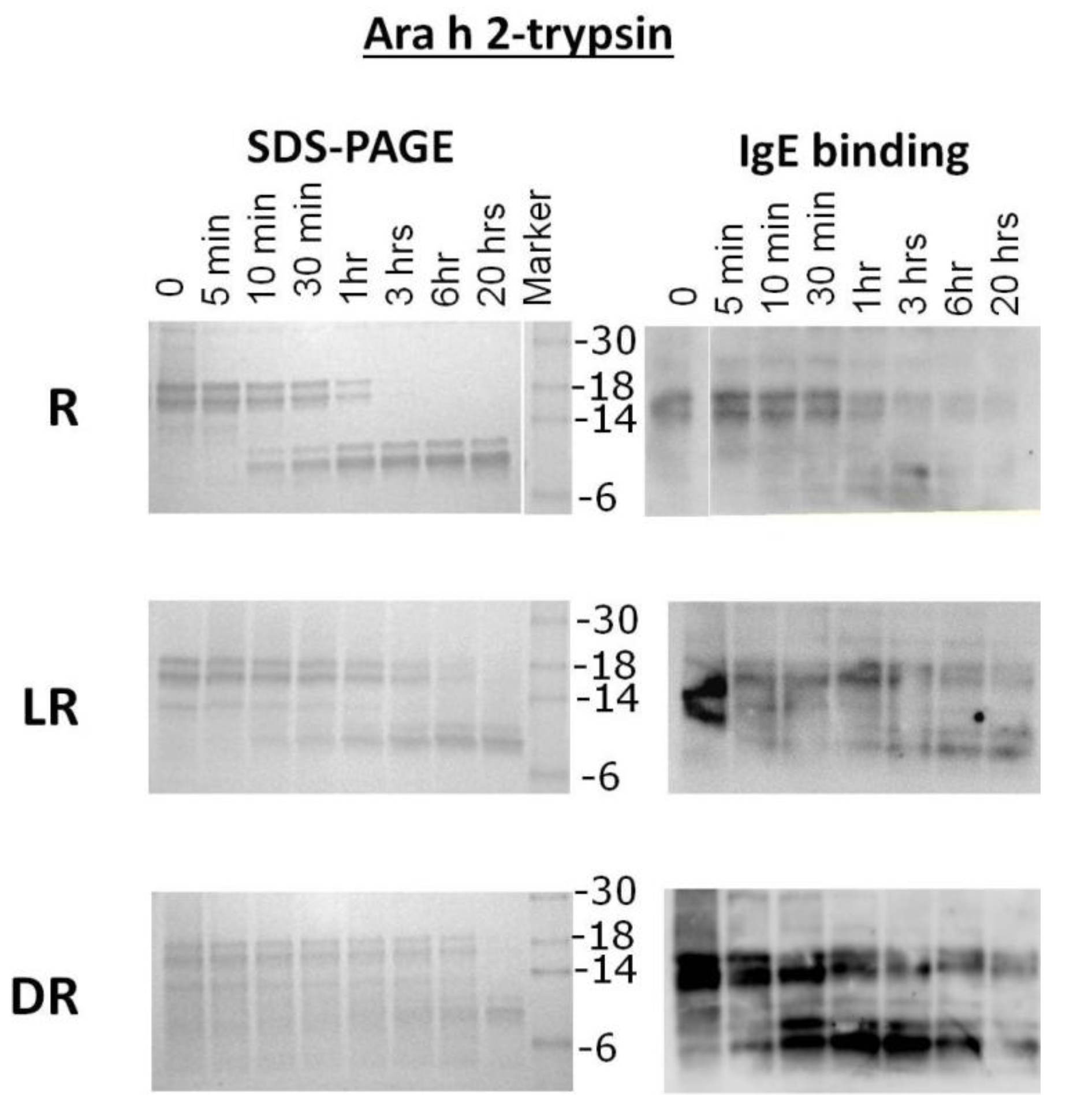 SDS-PAGE and IgE western analysis of the digestion of raw (R), light roast (LR) and dark roast (DR) Ara h 1 with trypsin. Raw Ara h 1 (top), light roast Ara h 1 (middle) and dark roast Ara h 1 (bottom) were digested with trypsin for the designated amounts of time. Sample taken prior to addition of trypsin is Time 0. The molecular weights of the marker proteins are indicated on the right.