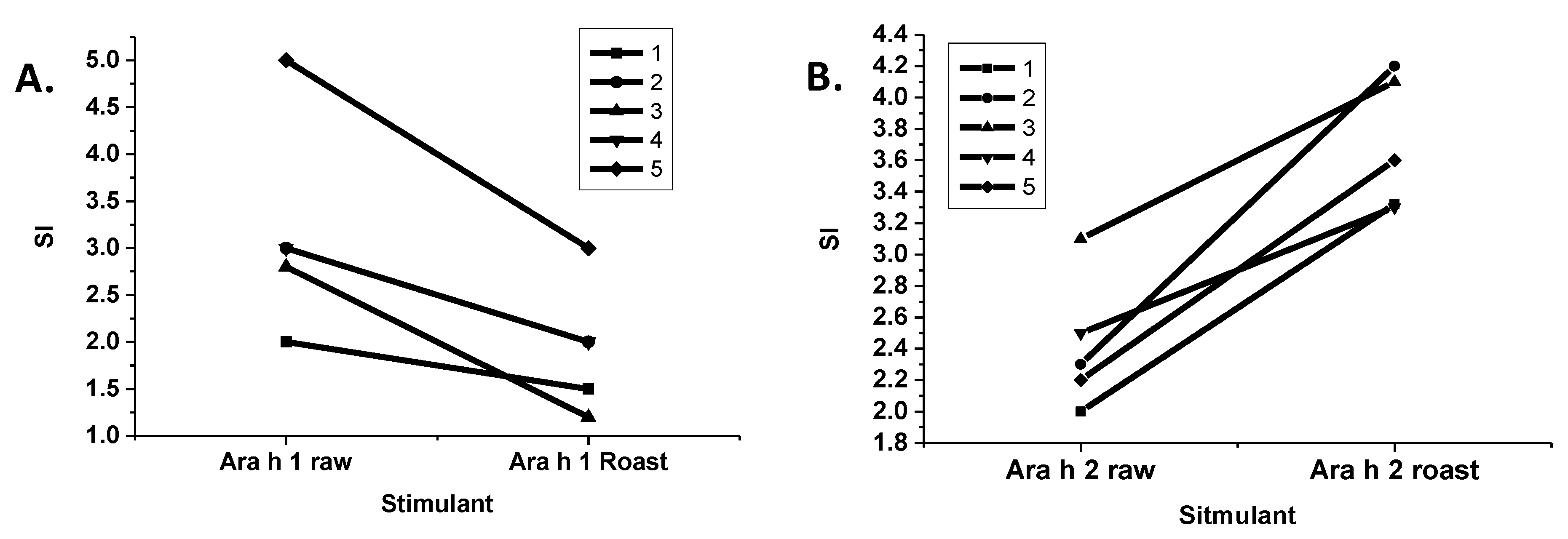 T-cell response to Ara h 1 and 2 purified from raw and roasted peanut extracts. Lymphocytes from five peanut allergic individuals were stimulated with Ara h 1 (A) or Ara h 2 (B) purified from either raw or roasted peanuts. The stimulation index (SI) is shown on the y-axis.