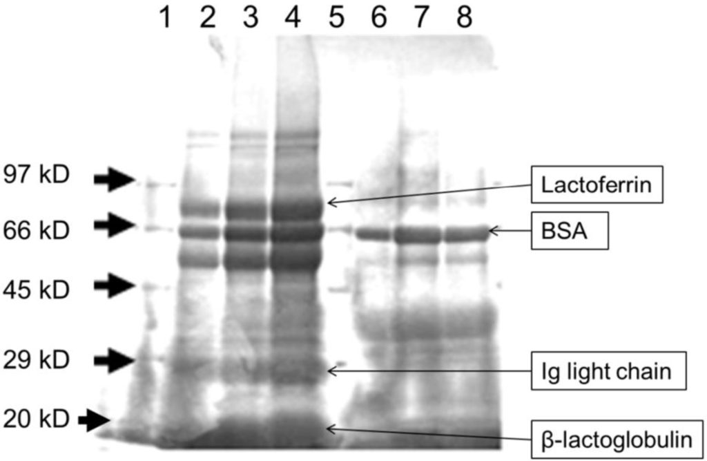 SDS-PAGE profiles of whey protein concentrates. Lanes 1 and 5: marker; lanes 2–4: low-temperature-processed whey protein concentrate (LWPC); lanes 6–8: high-temperature-processed whey protein concentrate (HWPC).