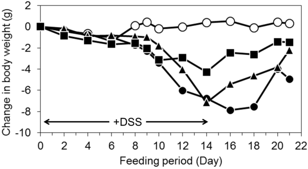 The effect of the oral intake of whey protein concentrates on body weight of dextran sodium sulfate (DSS)-treated mice. Opened circles, normal mice without DSS treatment; filled circles, DSS-treated mice; filled triangles, mice treated with DSS + HWPC feed; filled squares, mice treated with DSS + LWPC feed.