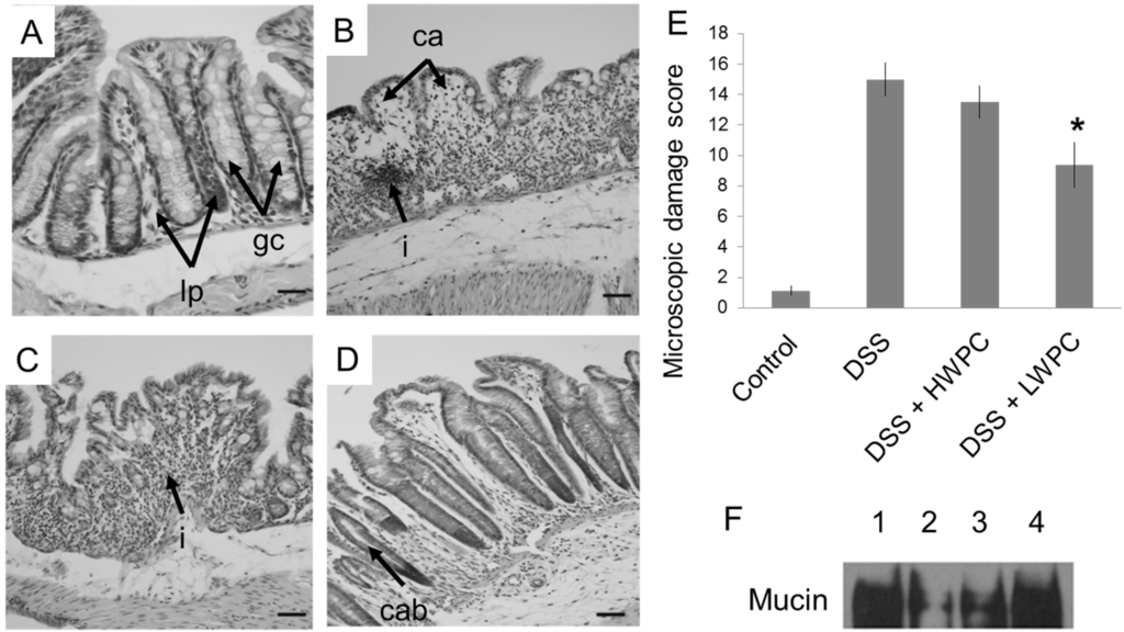 Histological effects of whey protein intake on DSS-induced colitis. (A–D) Transverse colon sections of mice on Day 21, stained with HE. (A) Normal mice without DSS treatment; (B) DSS-treated mice; (C) DSS mice treated with DSS + HWPC feed; (D) mice treated with DSS + LWPC feed (lp, lamina propria; gc, goblet cells; i, infiltration of leukocytes; ca, crypt atrophy; cab, crypt abscess; bars = 10 μm); (E) histological damage scores for the mouse colon on Day 21, evaluated according to Table 1. The final scores allocated are the average values of 25 slide spots of each different treatment group. * Statistically significant difference from the DSS group (p < 0.05). (F) Expression analysis of myeloperoxidase (MPO) and mucin in colon by western blot. Lane 1: normal mice without DSS treatment; lane 2: DSS-treated mice; lane 3: mice treated with DSS + HWPC feed; lane 4: mice treated with DSS + LWPC feed.