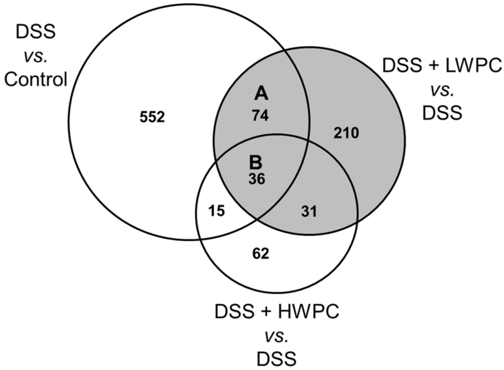 Venn diagram of differentially-regulated genes. Numbers show genes up- or down-regulated (≥2-fold), compared between the control (no treatment) and DSS, between DSS and DSS + LWPC and between DSS and DSS + HWPC groups.