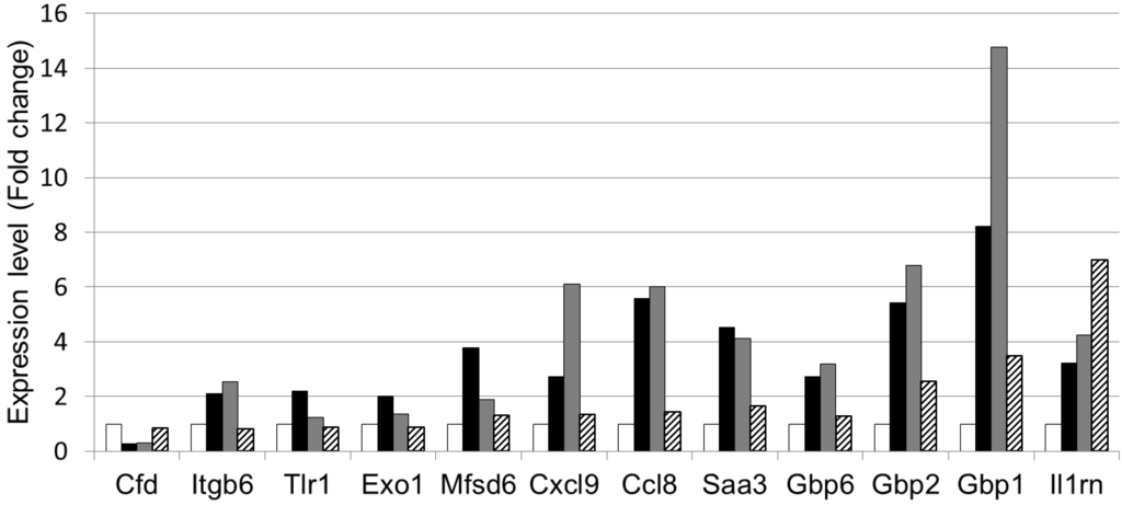 Expression of genes involved in the immune response that were differentially regulated by whey protein concentrate. The graph shows the relative expression level (fold change) determined by microarray analysis (white: normal mice without DSS treatment; black: DSS-treated mice; grey: mice treated with DSS + HWPC feed; hatched: mice treated with DSS + LWPC feed). The proper names of the genes are shown in Table 5.