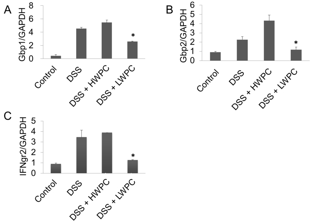 DSS-induced colitis was prevented by oral intake of LWPC, which also enhanced the recovery from colitis. Comprehensive analysis of gene expression in the colon by DNA microarray analysis showed that GBPs were downregulated by LWPC intake. Expression of GBPs is known to be regulated by interferon gamma. IFNgr2, a receptor for interferon gamma, was also downregulated by LWPC, which suggests that oral intake of LWPC results in the suppression of IFN gamma-mediated pathways and leads to the suppression of inflammation.
