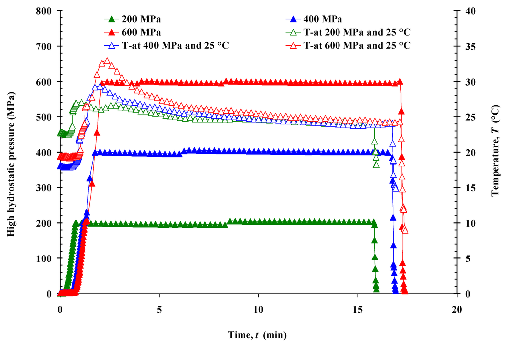 Representation of the temperature and pressure vs. time variation during HHP treatments (200, 400, and 600 MPa at 25 °C for 15 min).