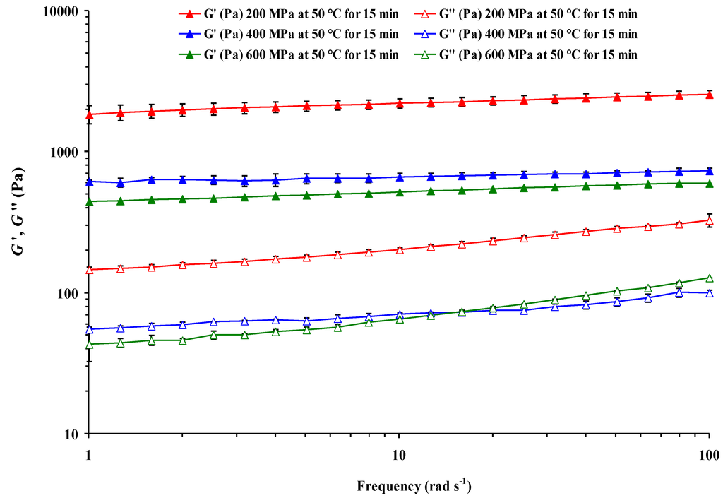 Frequency sweep tests of HHP-treated (Figure 2) and unpressurized samples were carried out in the LVE range after T equilibration to 25 °C, which enables the material to retain the structure. The LVE domain was previously established by an oscillatory stress sweep experiment for each sample, as shown previously [5]. For all HHP treatments, G’ values were greater than the G” values, showing a weak-gel behavior with G’ > G”, suggesting that elastic properties were dominant over viscous properties (Figure 2). Such behavior has been reported earlier for starch gels thermally induced from basmati rice [11] and HHP-induced CF gels [5].