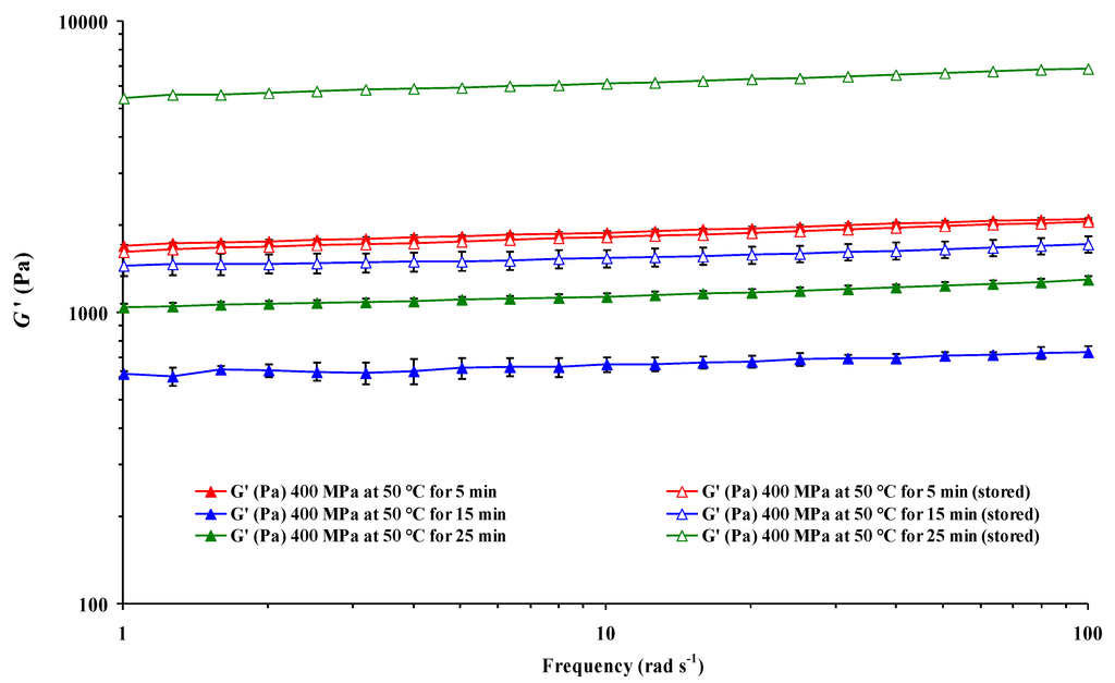 In turn, triple pressure × T × S, pressure × t × S, T × t × S interactions, and quadruple interaction pressure × T × t × S only were not significant for n’ (Table 1). Therefore, the effect of storage was also dependent on pressure and both T and treatment t. Once more, all the double, triple, and quadruple interactions had a more significant effect on the G” values of the heat-induced CF gels after pressurization. As an example, frequency sweeps of G’ for CF slurries HHP-treated at 400 MPa and 50 °C for 5, 15, and 25 min are shown in Figure 3, where it is possible to see that the effect of S on the G’ values at constant pressure and T was dependent on treatment t.