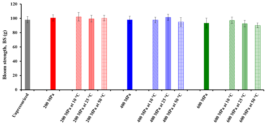 Stolt et al. [8] found a complete loss of birefringence in barley starch after HHP treatment at 600 MPa for 15 min. HHP-induced melting of sorghum starch granules started at pressures >300 MPa and complete gelatinization was obtained after treatment with 600 MPa [9]. However, the HHP-gelatinization in the presence of excess water is primarily depended on the applied pressure. The pressure range in which HHP gelatinization of starches can be achieved seems to be between 400 to 900MPa (400 MPa, e.g., for wheat starch and 800–900 MPa for potato starch) [10]. On the other hand, both starch and protein are the major chickpea components. Therefore, in this study, the presence of proteins might have also been responsible for the lower BS values of the CF gels with increasing pressure level. HHP treatment has been shown to influence the functional properties of proteins through the disruption and reformation of hydrogen bonds and hydrophobic interactions leading to denaturation, aggregation, and gelation [11]. The authors just cited inferred that the observed decrease in enthalpy for rice slurry after pressure treatment cannot be attributed solely to starch gelatinization or unfolding of proteins; rather, it results from combination of these components. These observations were supported by DSC data and the sodium dodecyl sulfate polyacrylamide gel electrophoresis (SDS-PAGE) indicated alterations in protein structures following HHP treatment. In turn, Fourier-transform infrared (FTIR) spectroscopy indicated a change in the secondary structure of post-process rice proteins. In any case, CF slurries subjected to 600 MPa at 25 °C for 15 min showed no peak and hence no enthalpy value, suggesting complete HHP-induced gelatinization of starch [5].