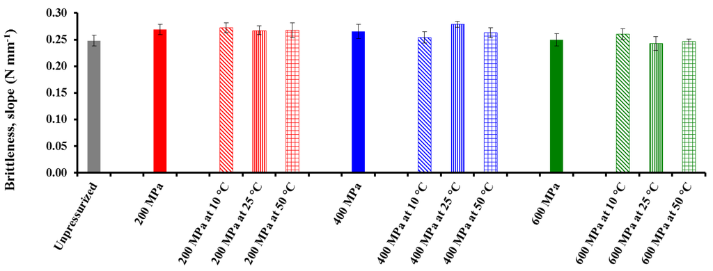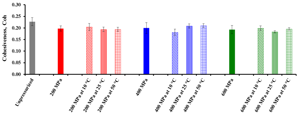 Gel strength is an indirect measure of the nature of a viscoelastic material [40]. It also indicates the overall consistency of the formed gel that includes mechanical rigidity or hardness, cohesiveness or internal binding, and elasticity or springiness. Figure 5 shows the slope of CF gels as a function of pressure and T. The lowest brittleness is associated with the highest levels of these two factors. In turn, Figure 6 shows the Coh values from TPA tests obtained for the heat-induced CF gels after pressurization. It can be seen that pressure did not have a significant effect on this textural property, and the highest Coh value corresponded to unpressurized heat-induced CF gel. The effect of treatment T on the Coh of the gels was dependent on the pressure applied. At 200 and 600 MPa, there was a decrease in Coh when T was increased from 10 to 25 °C, but at the highest pressure Coh increased again when T was increased to 50 °C. Conversely, after pressurization at 400 MPa, Coh increased when T was increased from 10 to 25 °C, but scarcely changed at 50 °C. According to Katopo et al. [16], starch pressurized in powder form displays a lower gelatinization temperature and enthalpy change than native starch, indicating damage and loss of molecular order and crystallinity resulting from pressurization at 690 MPa.