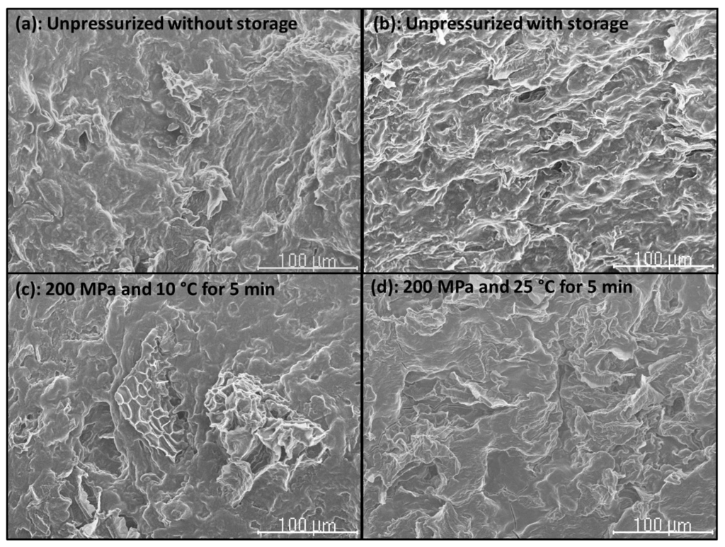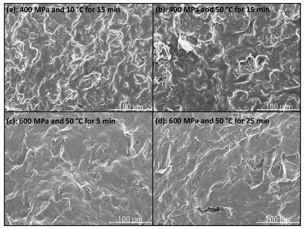 Some cell walls can be distinguished in the CF slurries treated with 200 MPa at 10 °C for 5 min (Figure 7c). As mentioned above, the lowest pressure, T, and treatment t could cause an increase in the linearity of the cell walls and volumes of particles owing to the permeability of the cell walls [25]. Similarly, no differences were visible between untreated sorghum flour slurries and sorghum flour slurries treated with 200 MPa or 300 MPa at 20 °C for 10 min [42].