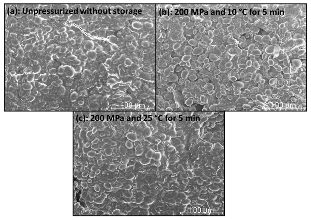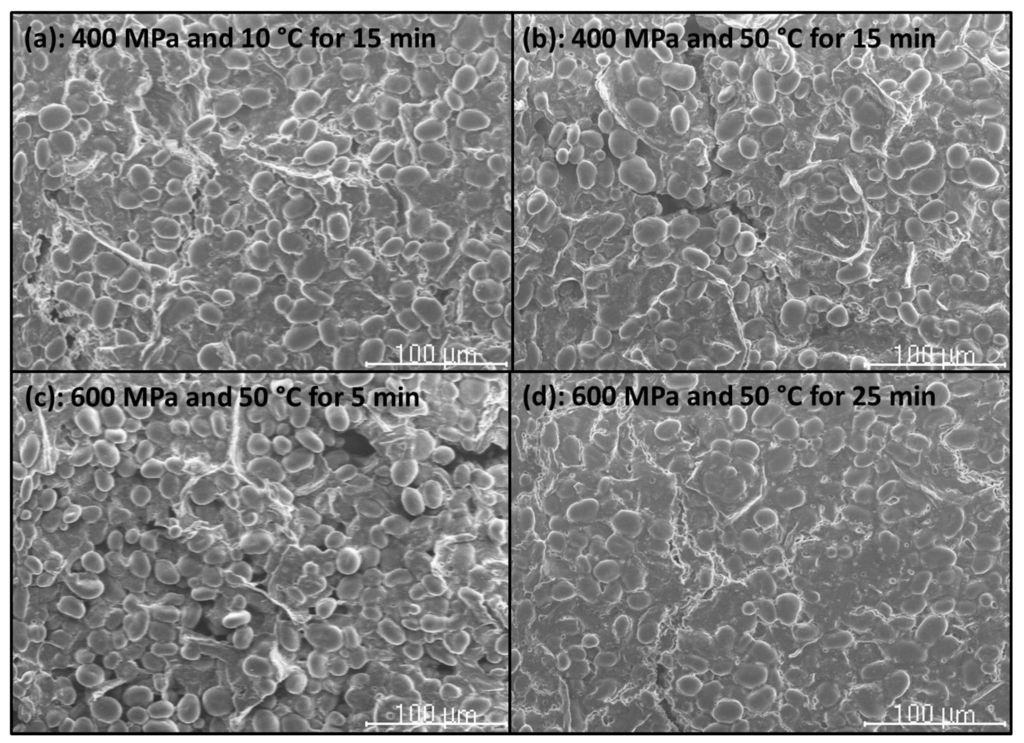 It can be seen that there is no observable difference for the samples without and with pressure treatment at 200 and 10 or 25 °C for 5 min (Figure 9b,c). This indicates that this low pressure may enhance the diffusion of water into the amorphous phase but is not high enough to destroy the crystalline structure [14]. There are no discernable changes in size, but the surface of the treated samples has become smoother. The smooth surface can also be explained by the water diffusion and granule swelling. Therefore, the SEM micrographs suggest preservation of granular structure after treatment with 200 MPa at 10 and 25 °C for the shortest treatment t. Vallons and Arendt [29] observed that the number of granules showing a “Maltese cross” decreased with increasing HHP or T above 300 MPa and 60 °C, respectively, indicating loss of crystallinity.