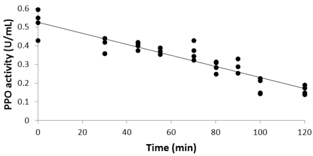 Complete PPO enzyme inactivation was achieved after 180 min, following a linear kinetic inactivation as described in Figure 1. The regression model was highly correlated (coefficient of determination R2 = 0.84), and can be represented by the following relationship: