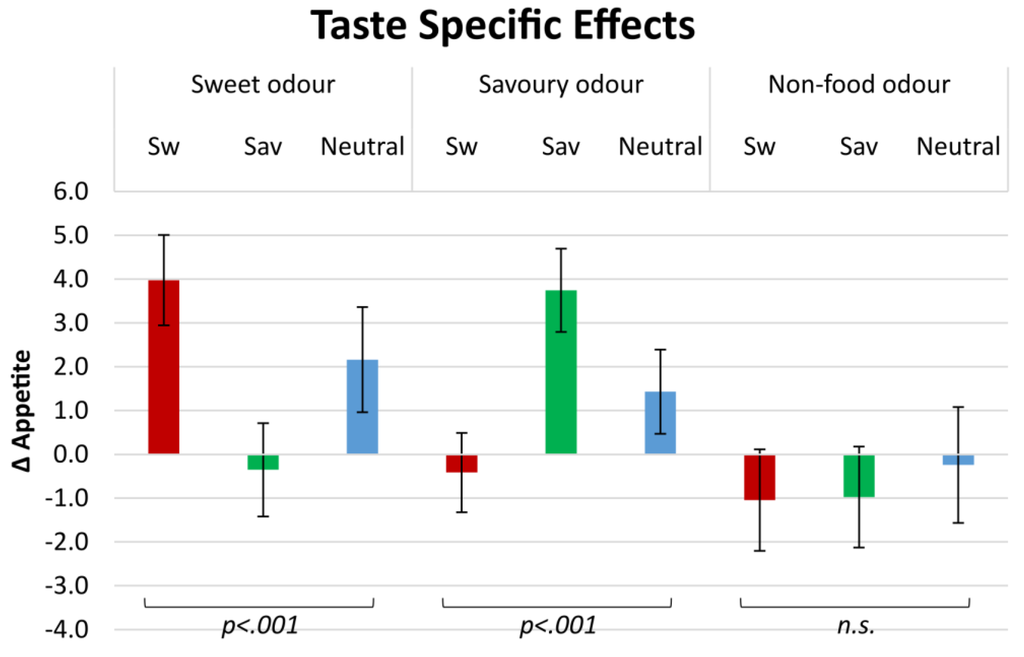 Our results indicate that odours that signal sweet products and odours that signal savoury products affect appetite in an opposite, but similar way. After smelling a sweet food odour, appetite for sweet products increases more compared to appetite for neutral (bread, croissant, and pancake) and savoury products. Similarly, after smelling a savoury food odour, appetite for savoury products increases significantly more than for neutral or sweet products. In line with this, the smell of flowers (fresh green), a non-food related odour, slightly decreased appetite ratings for sweet, savoury and neutral foods equally. These results are concurrent with those of Ramaekers et al. [,]. We suggest that the level of congruency between the odour and the product determines the strength of the appetizing effect of the odours. Interestingly, after removing the specific odour-product matches (e.g., chocolate odour = appetite for chocolate pieces) from our dataset, appetite for taste-congruent products remained higher compared to non-congruent products. Olfactory sensory-specific appetite is a phenomenon that not only applies to a specific product, but also to categories of products related to taste quality (sweet vs. savoury). By repeated exposure to the combination of an odour and the nutritional consequences after eating the food we smell, it is proposed that we learn to use (olfactory) food cues as predictors for macronutrient content [,]. These associations are most often described in terms of taste quality. Sweet taste is related to a high-carbohydrate content, whilst savoury taste is associated with a high-protein content [,,].